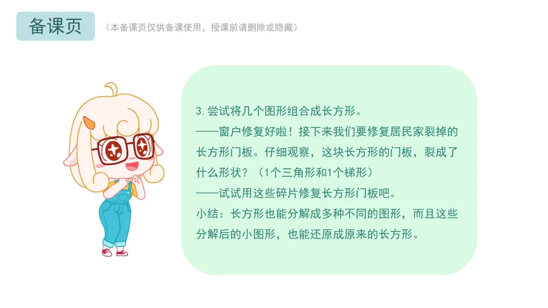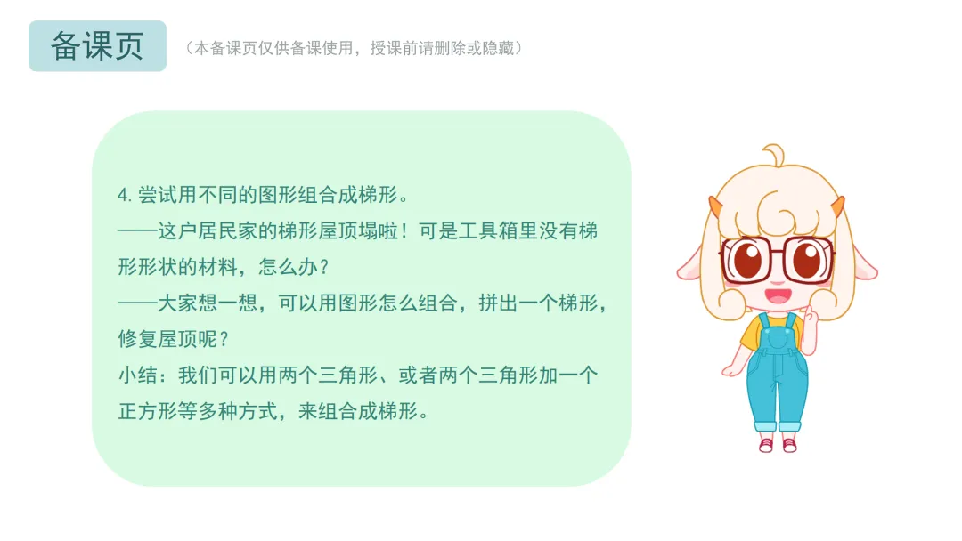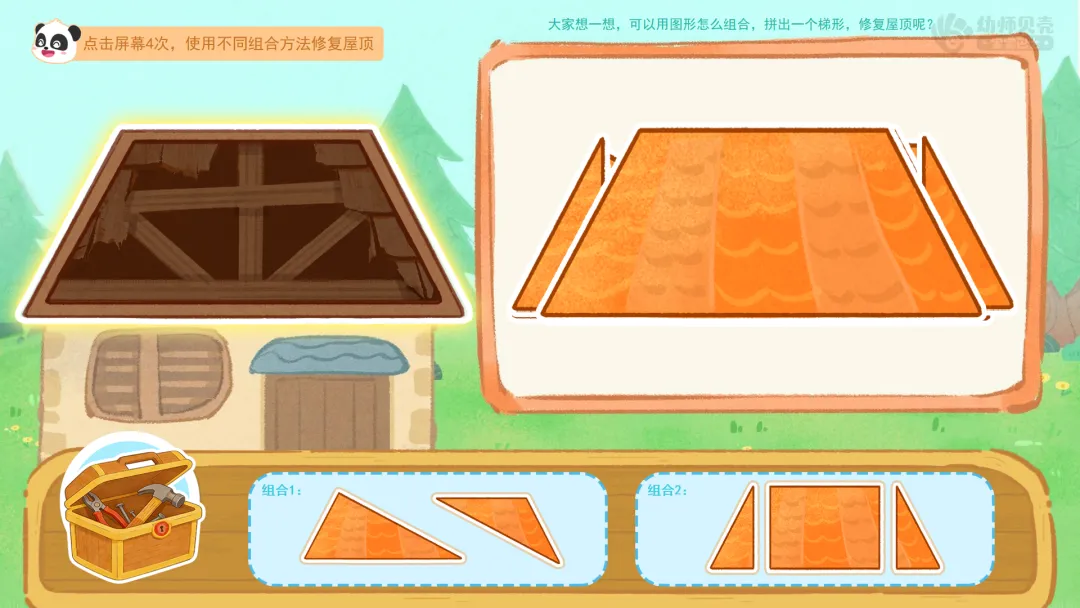 ——大家想一想,可以用图形怎么组合,拼出一个梯形,修复屋顶呢?
