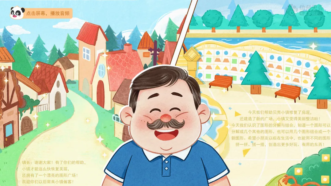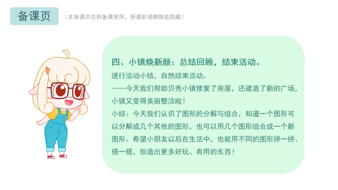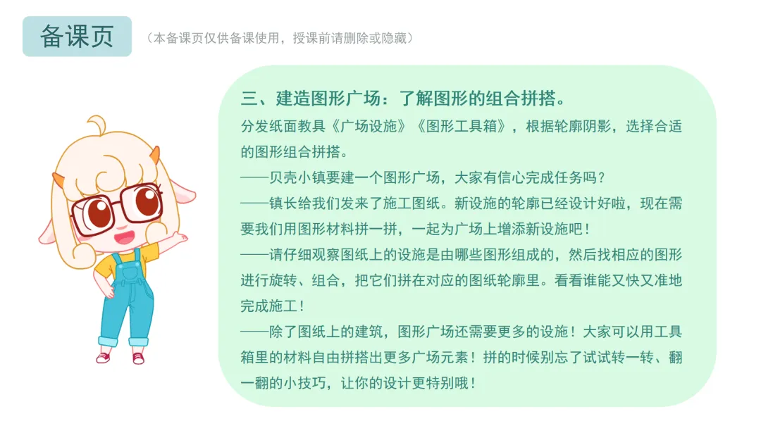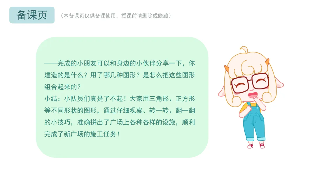小结:小队员们真是了不起!大家用三角形、正方形等不同形状的图形,通过仔细观察、转一转、翻一翻的小技巧,准确拼出了广场上各种各样的设施,顺利完成了新广场的施工任务!