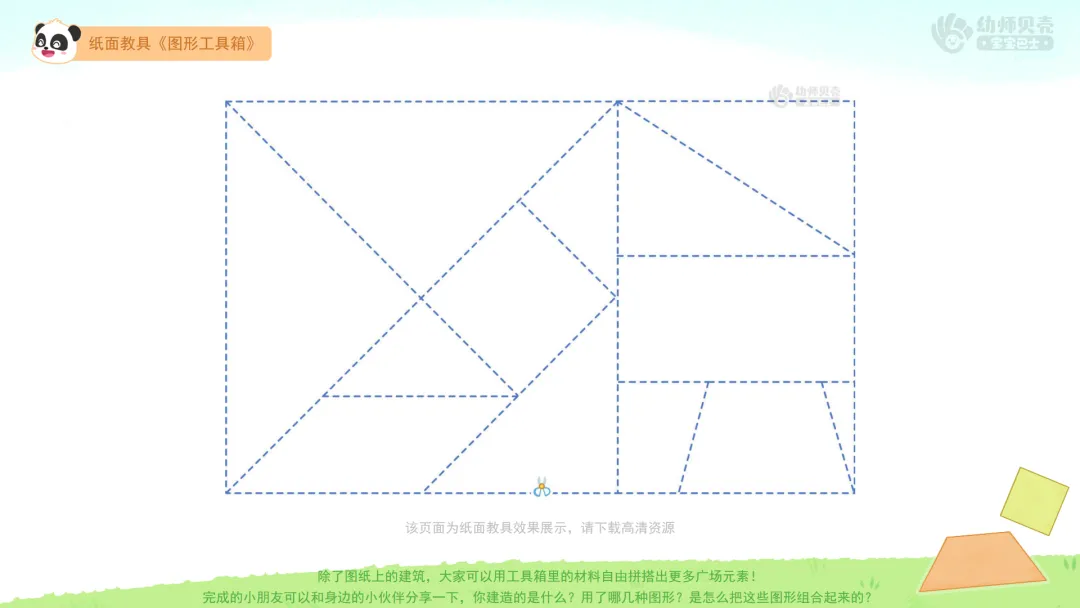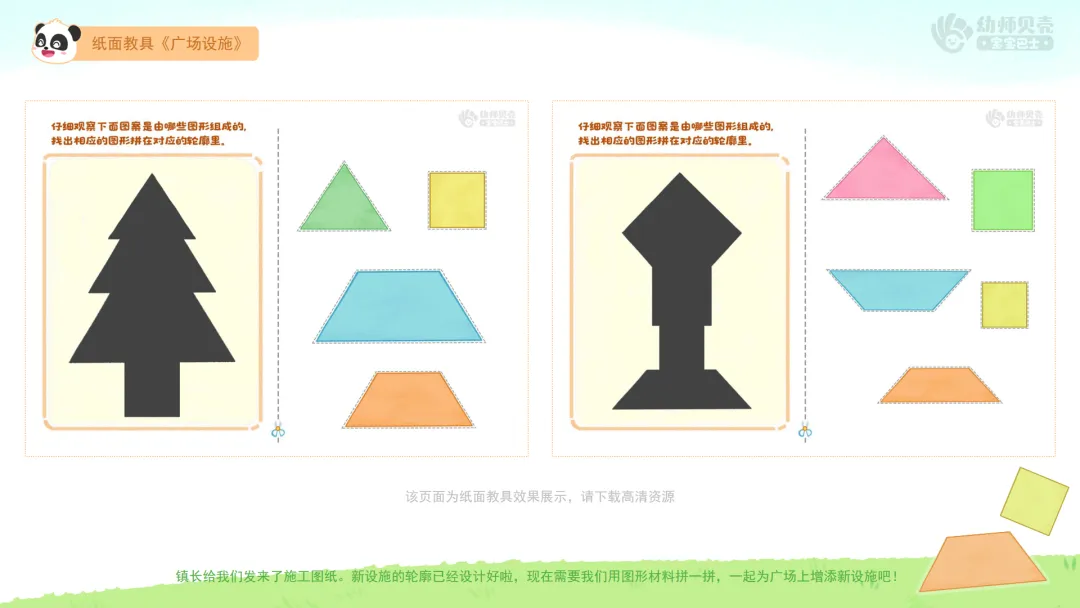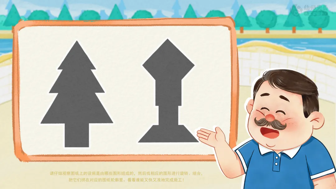 ——请仔细观察图纸上的设施是由哪些图形组成的,然后找相应的图形进行旋转、组合,把它们拼在对应的图纸轮廓里。看看谁能又快又准地完成施工!