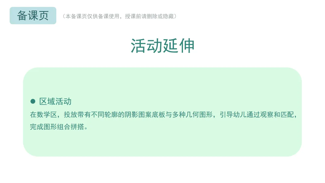 分发纸面教具《广场设施》《图形工具箱》,根据轮廓阴影,选择合适的图形组合拼搭。