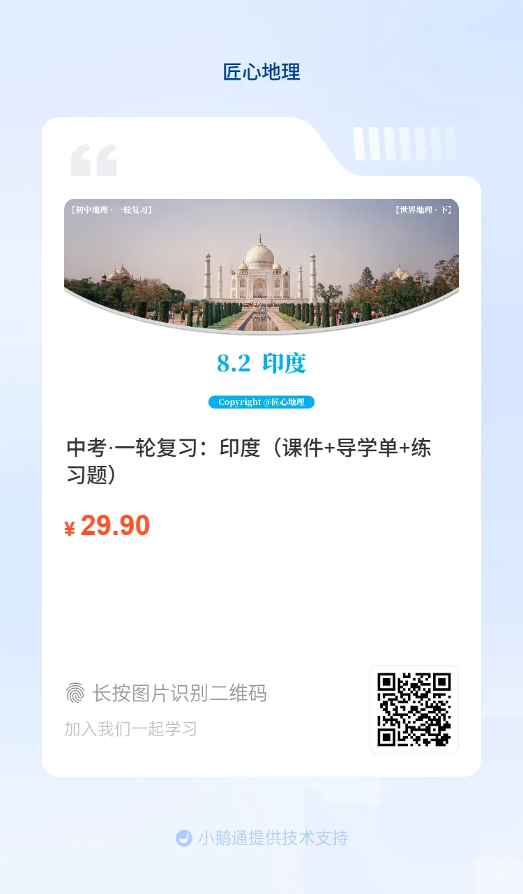 方式①:描下方二维码,获取新教材中考地理·一轮复习资料,含课件+导学单+练习题+送七八年级知识填图。(之前买过成套课件者,系统匹配优惠券,立减50)