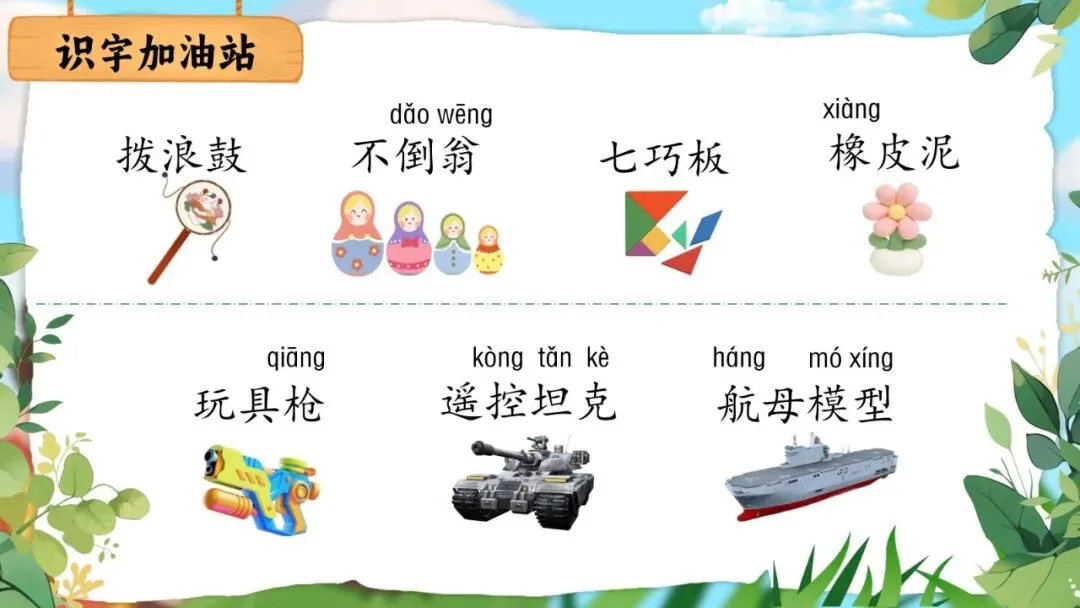 识字加油站列举7种玩具名称,引导学生联系生活认识与玩具有关的生字10个、写字2个(坦、克),体现生活中识字的理念。多音字"倒"在玩具语境中自然呈现。