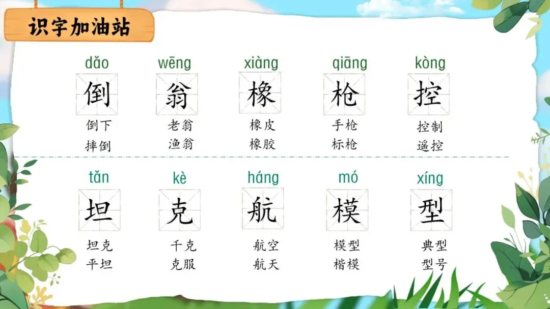•认识"倒、翁、橡、枪、控、坦、克、航、模、型"10个生字;能在语境中分辨多音字"倒"的读音;能认读7个有关玩具名称的词语,说出自己玩过的玩具。