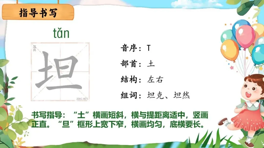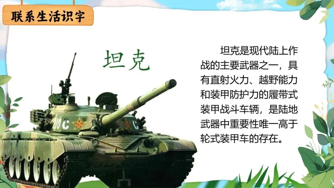 师:(出示"坦克"图片)这是坦克!坦克是现代陆上作战的主要武器之一,具有直射火力、越野能力和装甲防护力的履带式装甲战斗车辆,是陆地武器中重要性唯一高于轮式装甲车的存在。(生答)坦克最重要的是什么?(生:厚厚的铁甲,很结实)对,"坦"有平坦、坦然的意思——坦克行进在地面上,平平稳稳的。我们可以在生活中认识更多的字!
