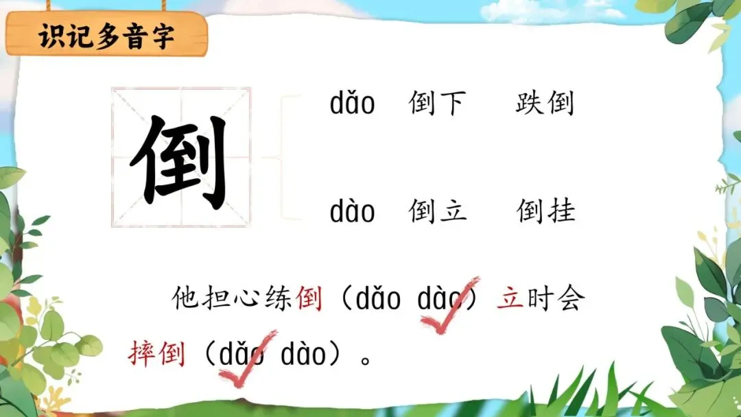 师:对!我们来看两个句子——"杯子摔倒(dǎo)了""倒(dào)一杯水"。(出示句子)一起读读,感受两个读音的不同。