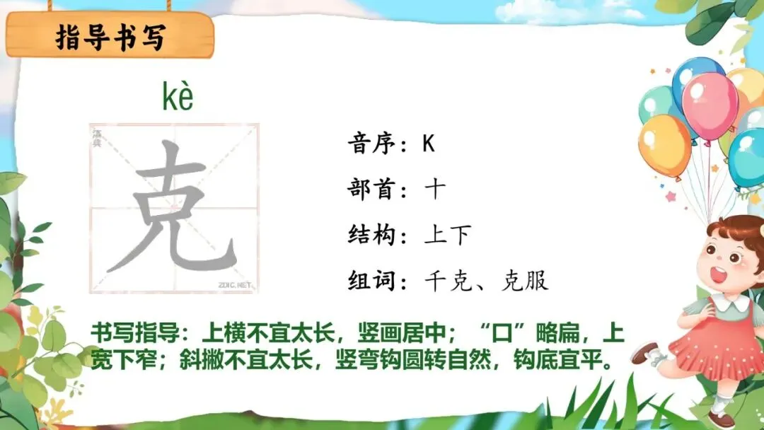 克 | 上下结构,上小下舒展。上半部分"十"窄小;下半部分"口"写得小而扁;最后两笔撇和竖弯钩要舒展。 |