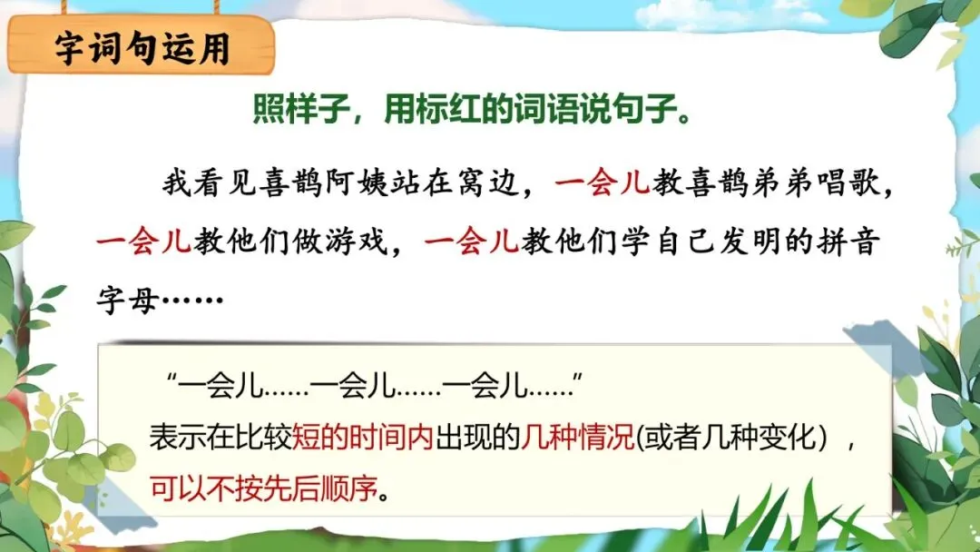 字词句运用安排两项内容:第一项借助《枫树上的喜鹊》中的例句,引导学生用"一会儿……一会儿……一会儿……"把短时间内做的几件事连起来说,培养想象力和语言表达能力;第二项照样子说说写写景物,要求学生先说出景物特点,再展开想象,将景物比作另一种事物,是对单元想象力训练的迁移运用。