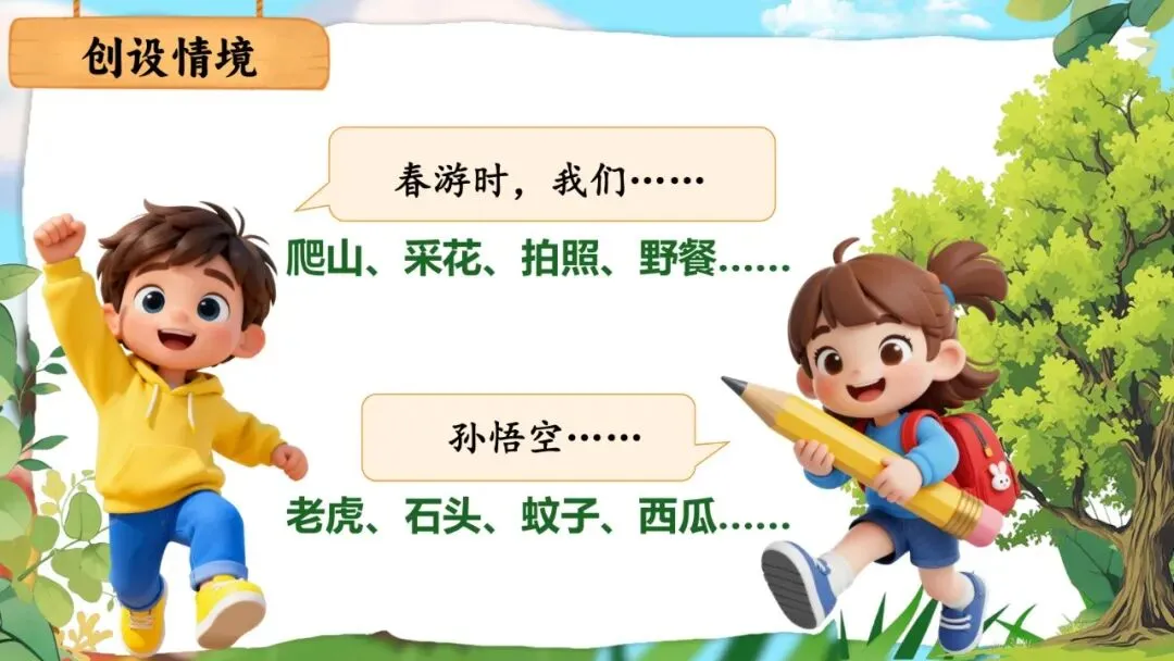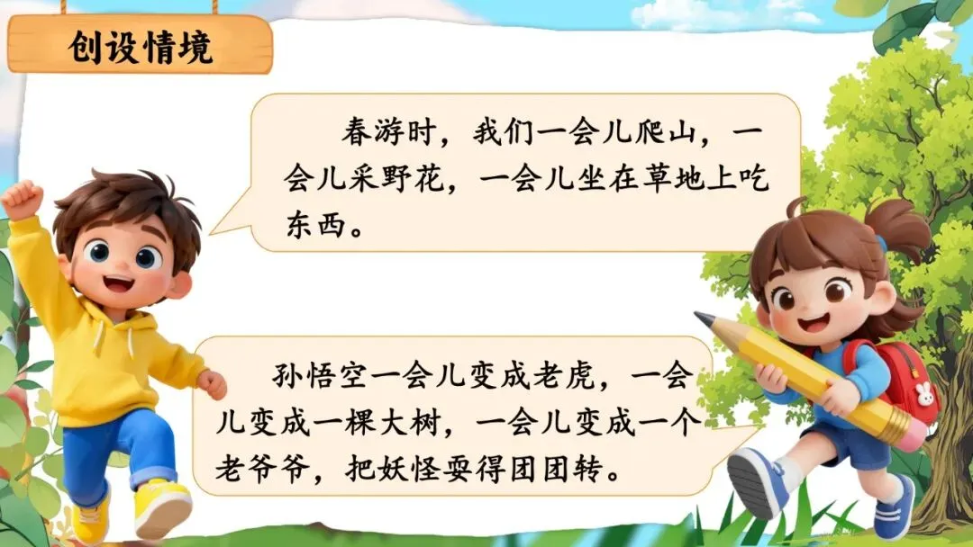 师:(出示泡泡)现在轮到你们当小播报员了!看看课本上的两个情境——