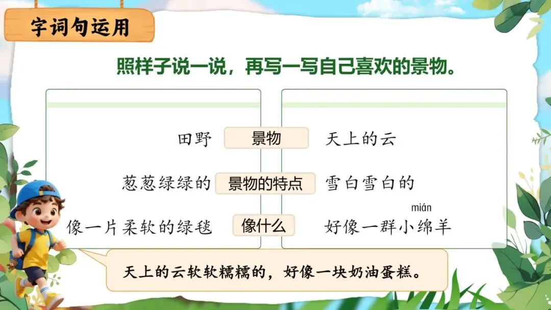 •第一课时内容较多(识字加油站+字词句运用两项),教学时间可能紧张,可根据班级实际适当调整,将"照样子写景物"的写一写部分放到课后作为作业完成。