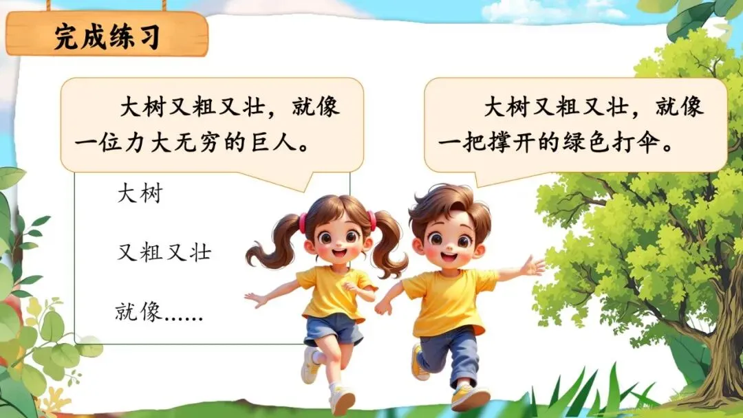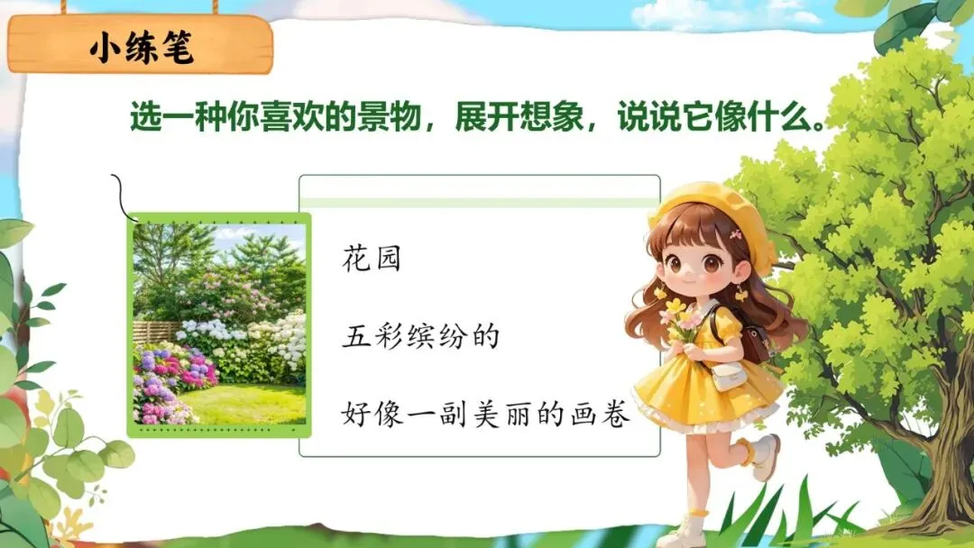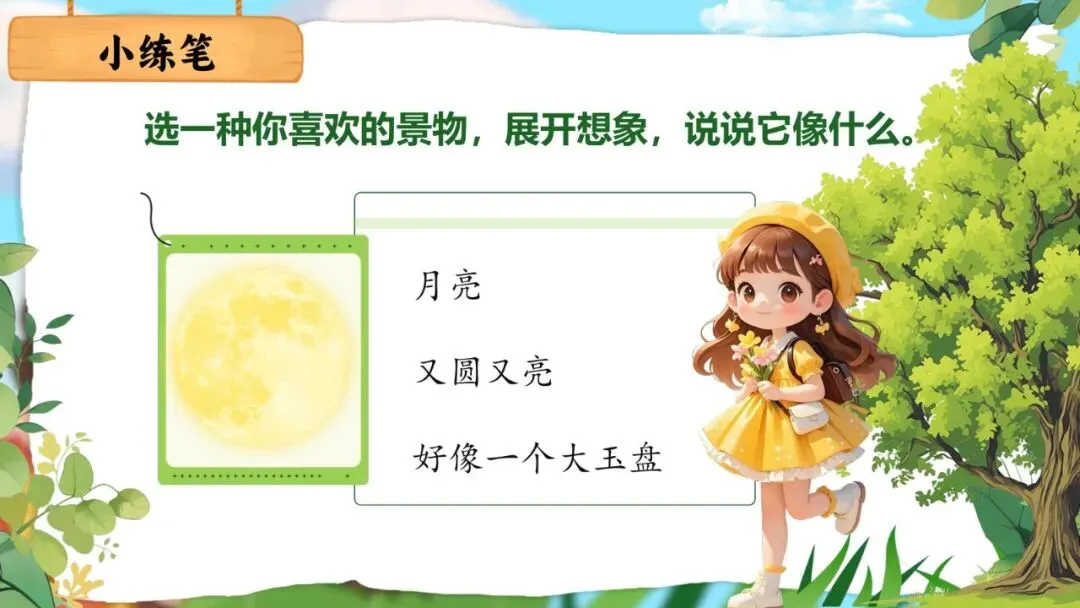 •照样子说说写写喜欢的景物(展开想象,将景物比作另一种事物)