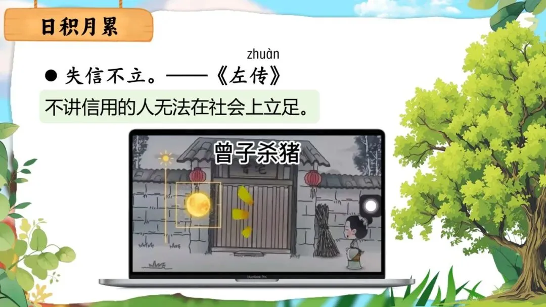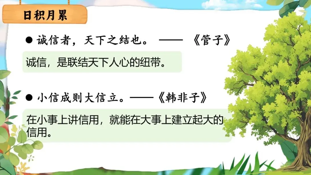 日积月累编排三句与"信"字有关的诚信名言,语言精练,在积累语言的同时潜移默化地培养诚信品质。