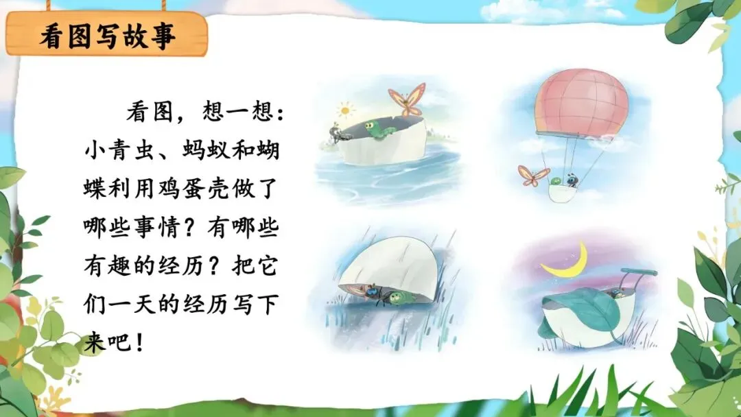 写话呈现四幅有序列的图画,要求学生借助时间词按顺序写出小青虫、蚂蚁、蝴蝶利用鸡蛋壳的奇妙一天,是二年级看图写话的重要训练,也是本单元想象力主题的延伸体现。