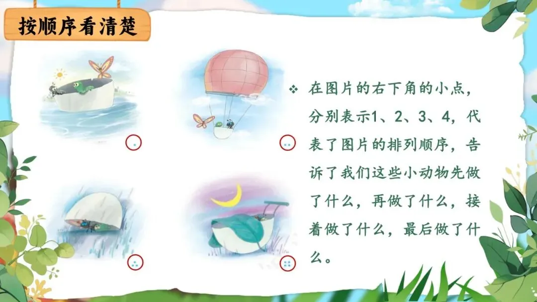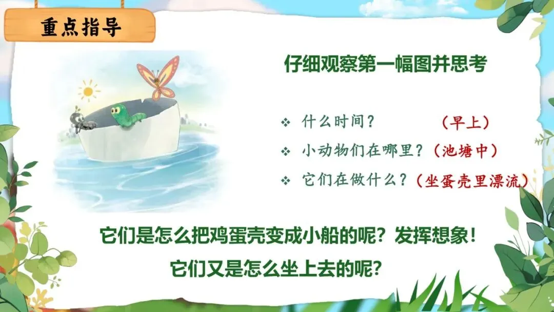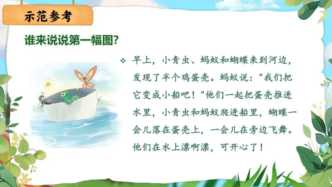预设参考:早上,小青虫、蚂蚁和蝴蝶来到河边,发现了半个鸡蛋壳。蚂蚁说:"我们把它变成小船吧!"他们一起把蛋壳推进水里,小青虫和蚂蚁爬进船里,蝴蝶一会儿落在蛋壳上,一会儿在旁边飞舞。他们在水上漂啊漂,可开心了!