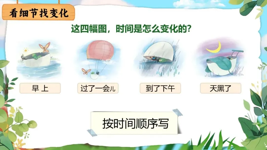 师:用上"早上……过了一会儿……到了下午……天黑了……",故事就有了清晰的线索,读的人一下子就能看出故事是一天发生的!这就是按时间顺序写的好处。