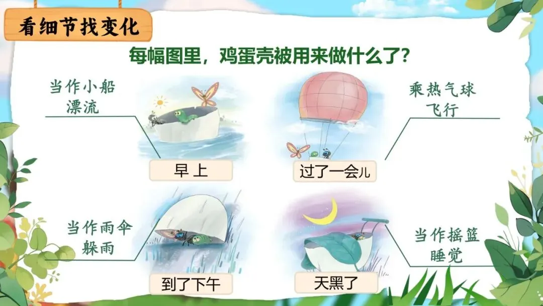 师:那它们是怎么把鸡蛋壳变成船的呢?发挥想象!(生:把蛋壳放进水里,爬进去……)