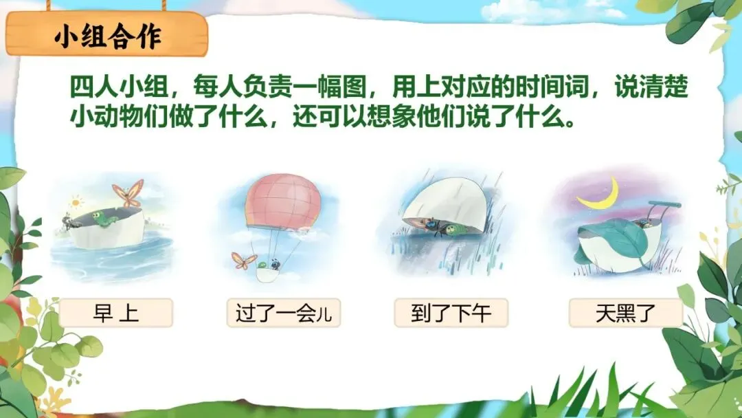 师:接下来,我们把后面三幅图分组来说一说。四人小组,每人负责一幅图,用上对应的时间词,说清楚小动物们做了什么,还可以想象他们说了什么。