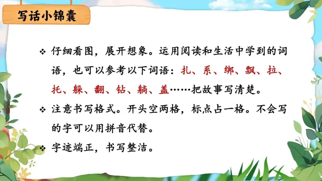 师:写故事之前,老师有几条温馨提示——(出示写话小锦囊)