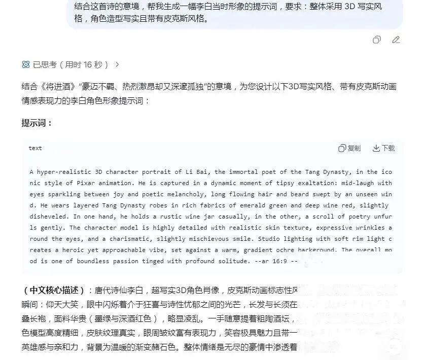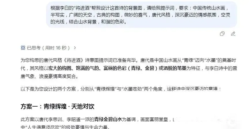打开 DeepSeek,开启深度思考模式,输入你的需求。比如你想做《将进酒》,就让它根据诗意生成一段专业的生图描述。