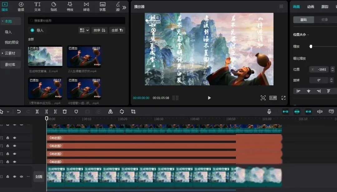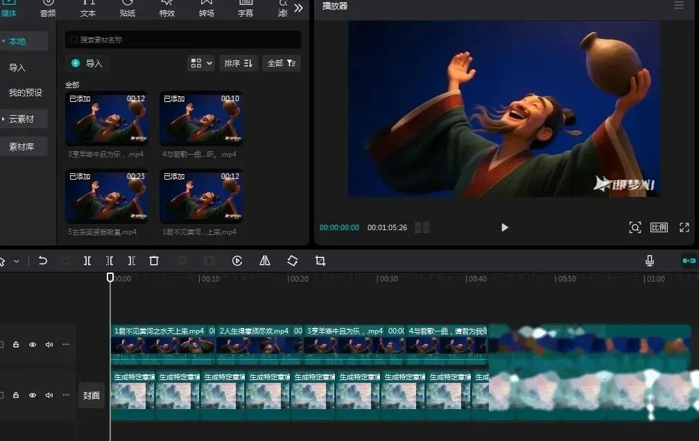 点击生成,一个会动、会笑、会说话的李白就搞定了。重复这个步骤,把整首诗的诵读视频都做出来。