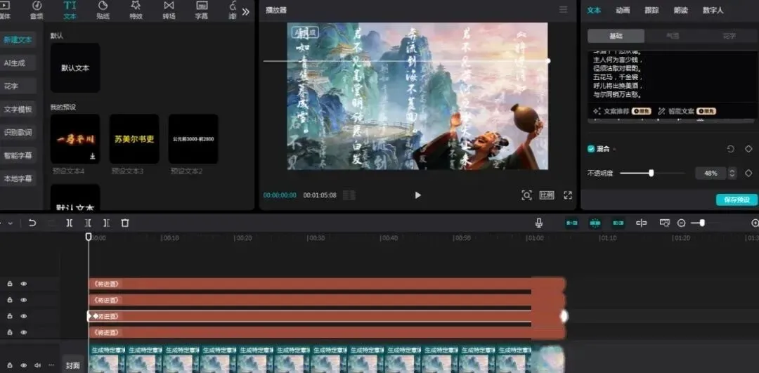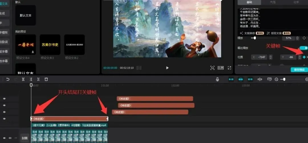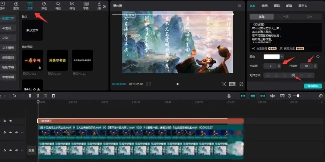添加文本,选一个有质感的书法字体,设为竖排。把文本拉满全片。