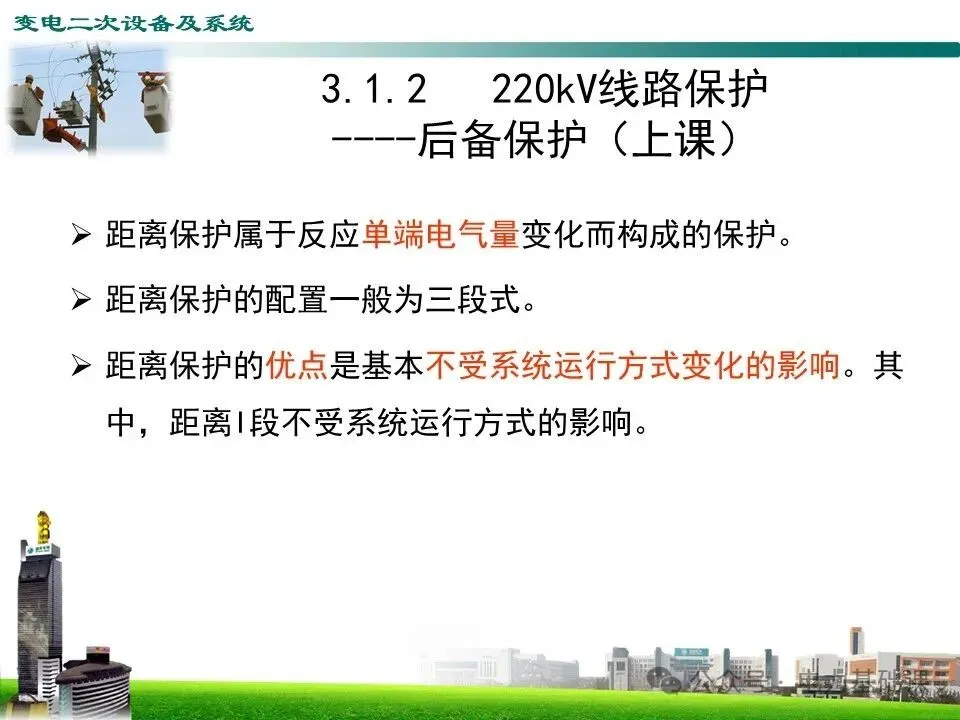 距离保护的优点是基本不受系统运行方式变化的影响。其中,距离I段不受系统运行方式的影响。