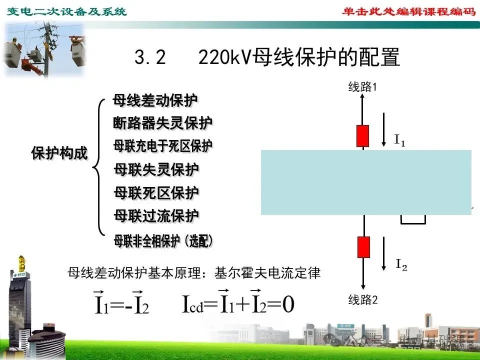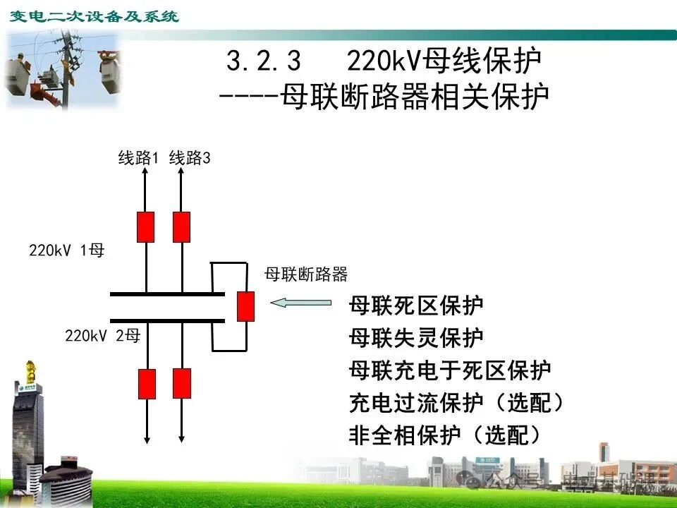 220kV母联开关相关保护:母联死区保护、母联失灵保护、母联充电于死区保护、充电过流保护(选配)、非全相保护(选配)。