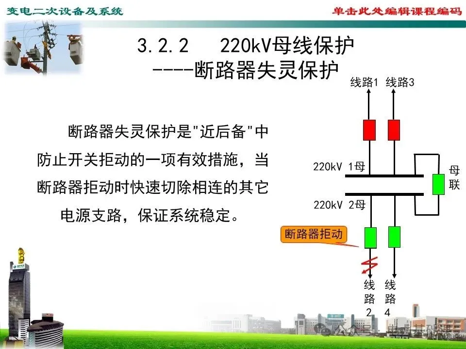 当系统发生故障,故障元件的保护动作而其开关操作失灵拒绝跳闸时,通过故障元件的保护作用其所在母线相邻开关跳闸,有条件的还可以利用通道,使远端有关开关同时跳闸的保护称为开关失灵保护。开关失灵保护是"近后备"中防止开关拒动的一项有效措施,当断路器拒动时快速切除相连的其它电源支路,保证系统稳定。