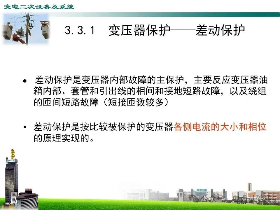 差动保护是变压器内部故障的主保护,主要反应变压器油箱内部、套管和引出线的相间和接地短路故障,以及绕组的匝间短路故障(短接匝数较多)