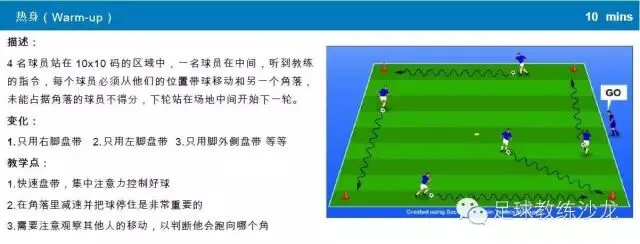 热身:采用有球方式,其实针对U8-10这个年龄段的孩子结合的热身,我个人是非常认同的,也可能我带的班都控制在20人之间,直接一人一球,开始热身挺好。如果你觉得有哪个小家伙调皮导弹了,OK,变成无球也可以,或者干脆让他抱着球,不是门将抱着球不让踢的滋味不好过吧!