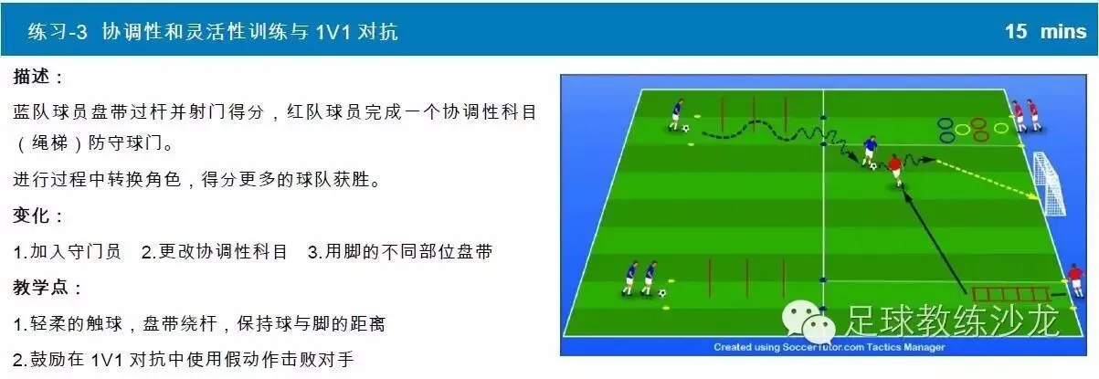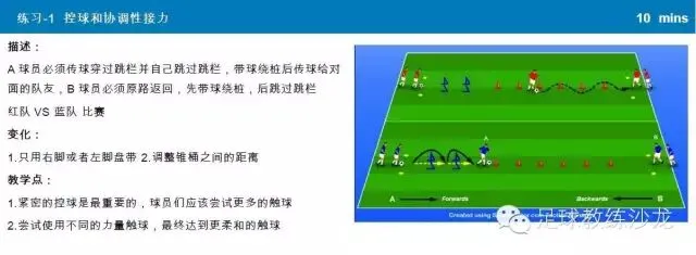 练习1:将无球协调性(跨、跳)和有球协调性(带球穿桩)相结合,重点训练球员控球能力,比赛的方式更能激发小队员的斗志,还可以变化一下成为传球训练或者射门训练是不是?