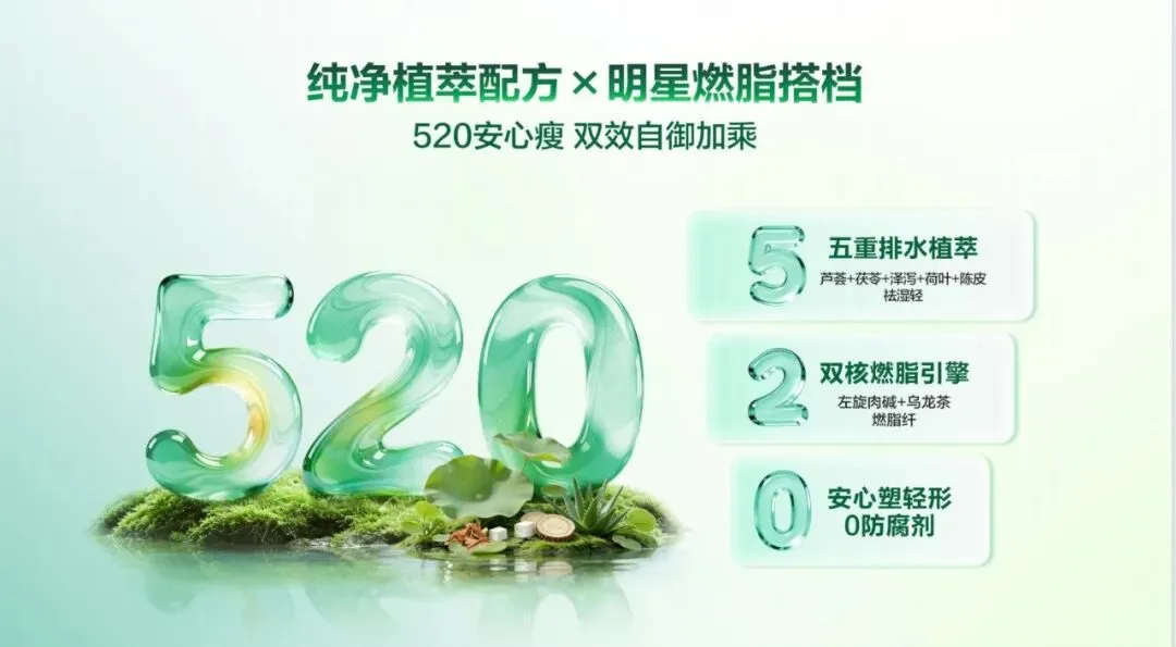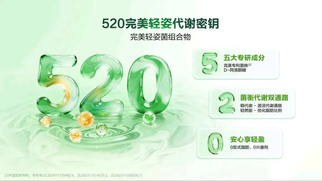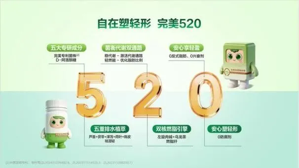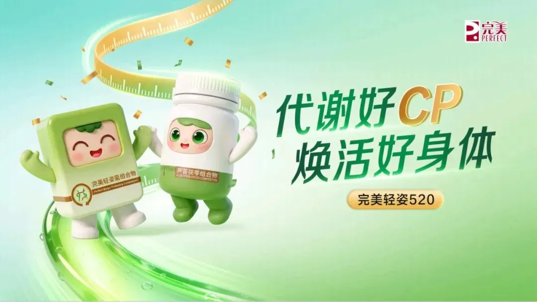 人”,还是熬夜加班的“透支者”、饮食不规律的“忙碌族”,都能在它的助力下,找到属于自己的轻盈之道。讲到这里,相信大家都记得完美 520 了! 5:完美轻姿菌,五大专业成分;小茯星,五重排水植萃 2:完美轻姿菌,菌衡代谢双通路;小茯星,双核燃脂引擎