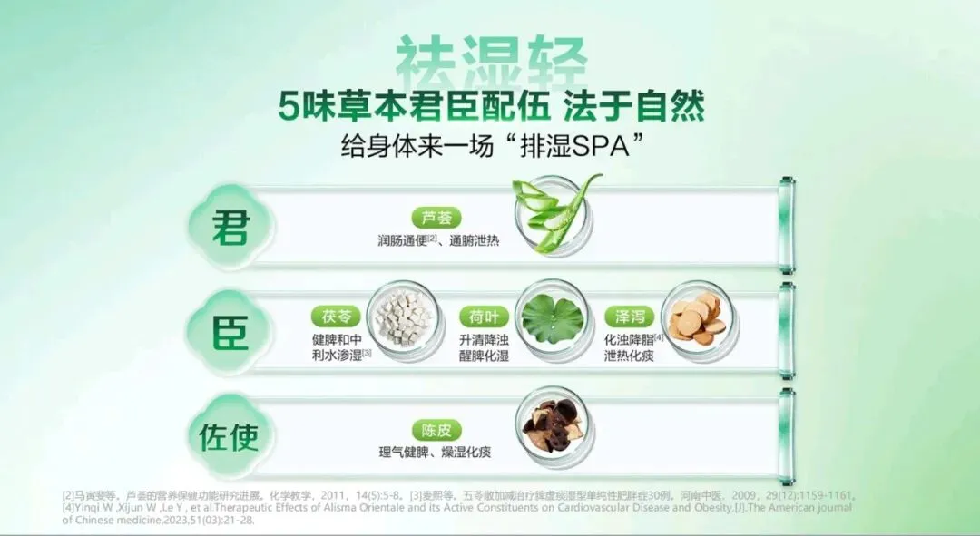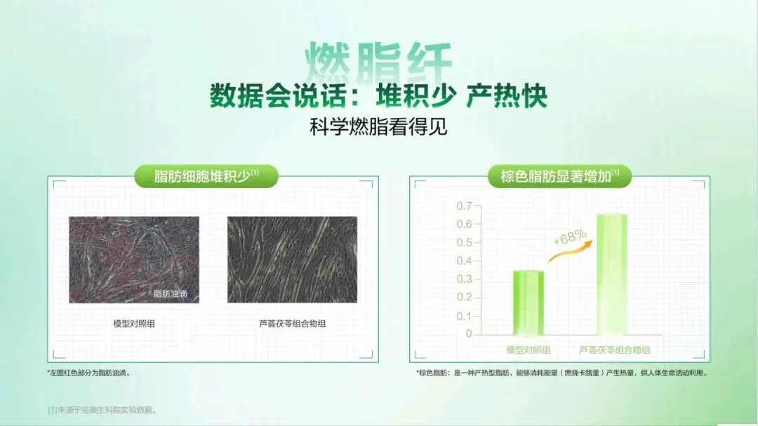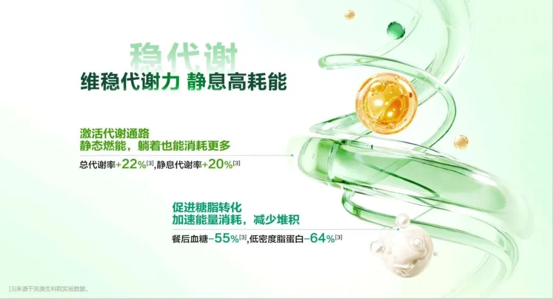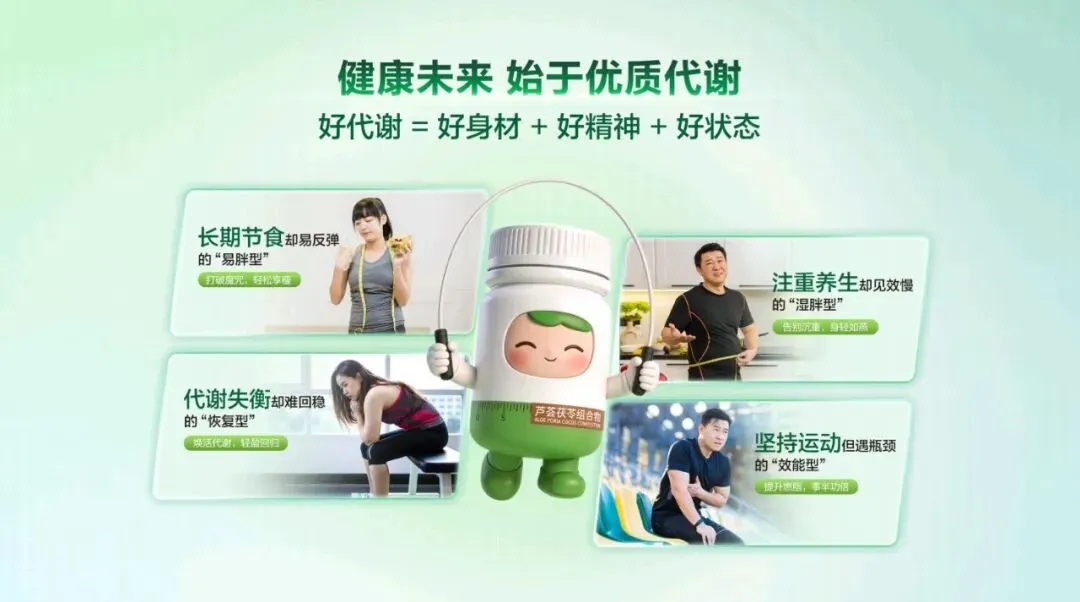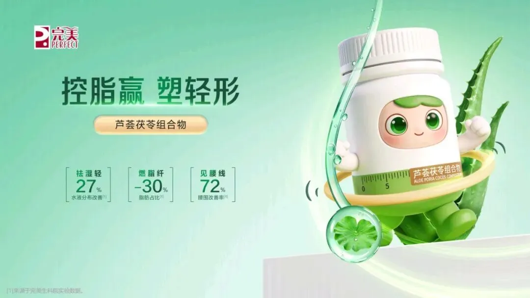 今天,非常荣幸能为大家介绍这款专为现代人代谢管理 打造的全新力作——代谢 CP。 代谢 CP 是由小茯星与躺赢菌组合而成,它们不仅承载 着完美在代谢领域多年深耕的科研结晶,更以“完美轻姿 520”为核心,帮助我们从容应对身体轻盈的挑战,开启健 康管理的新篇章。减脂困难,问题可能不止出在脂肪上。湿气重、代谢慢、 燃脂低、餐后体重增加等问题,都可能让减脂之路困难重重。 运动时汗流浃背但体重不变,这是燃脂低下的“无效 汗”;久坐不动,稍微吃点就容易囤脂肪,导致腰腹难减, 形成“游泳圈”;大餐一顿后,次日体重增加,让人后悔不 已;起床乏力、动则疲惫,是湿气淤堵导致的虚胖。这些问题都表明,减脂不能只关注脂肪,还要重视身体 的湿气和代谢状况体重居高不下,或许是身体长期“收大于支”。这包含 两个层面的失衡。其一为能量失衡,当摄入热量远超消耗热 量,多吃少动就会造成热量过剩,这些过剩的热量会逐渐转化为顽固的脂肪,在身体里扎根。 其二是代谢失衡,即便饮食量不变,但身体代谢能力降 低,水湿和垃圾难以排出体外,就会在体内堆积淤堵,进而 产生痰湿。所以,想要解决体重问题,需要从这两个失衡点 入手,调整能量摄入与消耗的平衡,提高身体代谢能力,减 少痰湿的产生常言道“十胖九湿”,湿气和肥胖往往如影随形。湿气 的程度不同,在身体上的表现也存在差异。湿气处于一级时, 主要表现在表面,会出现面部或头发油腻、口腔黏腻等症状。 到了二级,湿气深入肌肉,身体会有困重感,小腿像灌了铅 一样。发展到三级,湿气影响到骨骼,四肢会浮肿,关节也 会沉重酸痛。四级时,脏腑受到影响,会出现舌苔厚重黏腻、 口气重等情况。到了五级,湿气弥漫全身,人会变得肥胖, 还会感觉头重如裹。我们要多关注自身身体状态,判断自己 属于哪种湿气类型,才能更好地调理身体。身体感觉像被堵住,或许是“痰湿”体质在捣乱。“喝 水都胖”的根源在于痰湿困脾。当我们吃得多或压力大时, 肠胃就会“罢工”,导致代谢变慢,水湿排不出去,进而变 成“内湿”。随着湿气变黏,就会形成“痰”,这时人开始 发胖、脸油、痰多。“痰”还会堵住“气机”,让人身体“憋” 着火,出现虚胖、易上火的症状。最终,就形成了易胖体质, 减肥难且容易反弹。这就好比身体的“下水道”——脾胃功 能堵塞,喝的水、吃的食物排不出去,变成“垃圾”(痰湿) 堆积在体内。在人体每天总能量消耗中,基础代谢占据了 60%至 75%, 也就是说,我们静息状态下维持心跳、呼吸、体温等基本生 命活动所消耗的能量,才是真正的“大客户”。所以,掌控 好基础代谢,才能真正实现“轻盈自‘燃’而然”,让身体 成为一个高效的燃能系统。 那么,如何有效提升基础代谢? 关键看三个因素: 第二,脂肪比例。脂肪可分为白色脂肪与棕色脂肪,其中白 色脂肪是储存能量,棕色脂肪是产热耗能。也就意味着,白 色脂肪越少,棕色脂肪越多,基础代谢越高。 第三,肌肉含量。肌肉是身体的“燃能大户”,肌肉越多, 基础代谢越高芦荟茯苓组合物,能助力我们控脂赢、塑轻形。其燃脂 纤效果显著,能让脂肪占比降低 30%,相当于帮我们减少了 大量顽固脂肪,让身体更加轻盈。 湿气重会让身体像被湿布包裹,而该组合物能调节水液 分布,减轻身体的湿重感。实验数据显示,本组合物可以显 著改善水肿情况,帮助减少湿气困扰。 更令人惊喜的是,它在腰围改善效果表现非常出色,高 达 72%的体验官反馈腰围改善明显,让我们能明显看到身材 维度的变化,拥有更优美的身材曲线。芦荟茯苓组合物的作用机制是内源祛湿消脂两步走策 略,巧妙融合中医草本智慧与现代前沿科学。中医草本智慧 在调理“湿气”方面有着独特优势,能从根本上调节身体的 痰湿状况。现代前沿科学则在攻克“脂肪”问题上发挥关键 作用,助力身体更好地进行脂肪代谢。 该组合物包含多种有效成分,左旋肉碱和乌龙茶能加速 燃脂,减少脂肪吸收;芦荟、陈皮、茯苓、泽泻和荷叶则侧 重于健脾祛湿,调节痰湿体质,改善身体的代谢功能。这些 成分相互配合,共同为身体的健康和轻盈助力。“祛湿轻”这一核心卖点,关键在祛湿不滞留,实现消 肿更轻盈的效果,采用的是“一清、二调、三固”的祛湿黄 金组合策略。