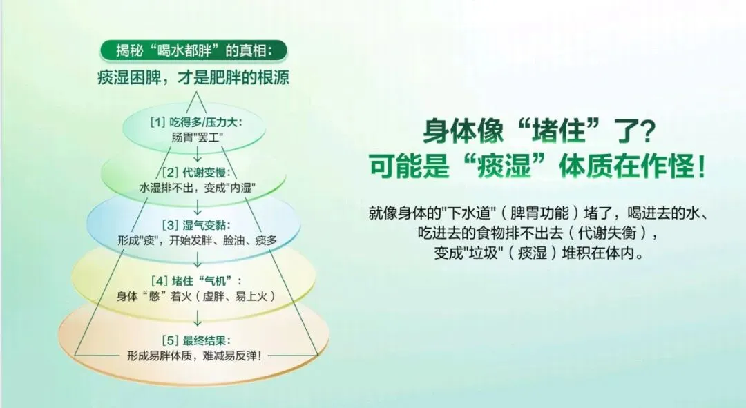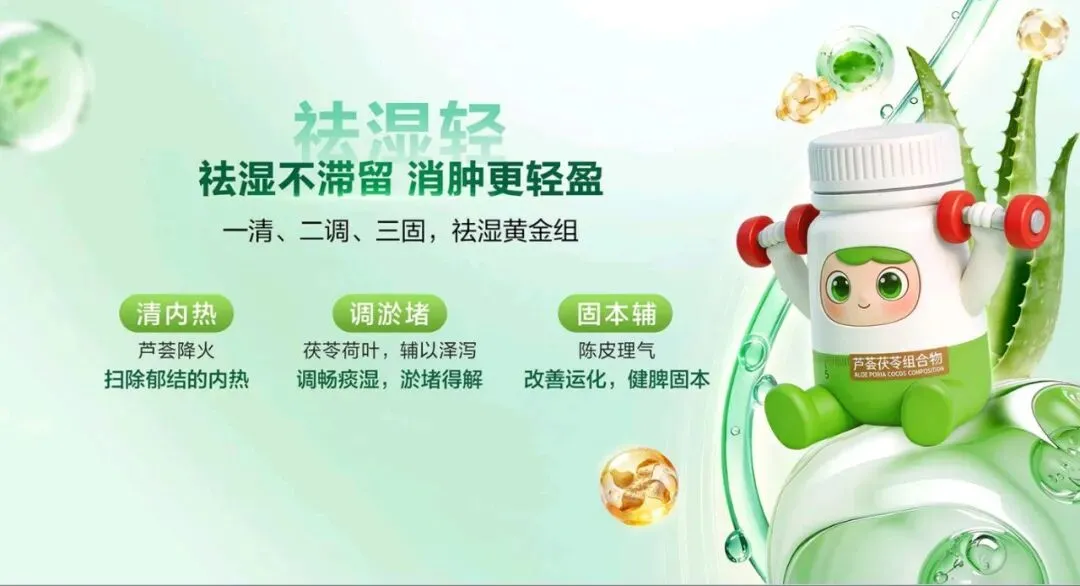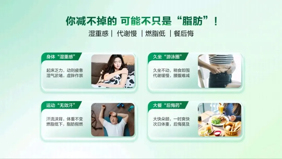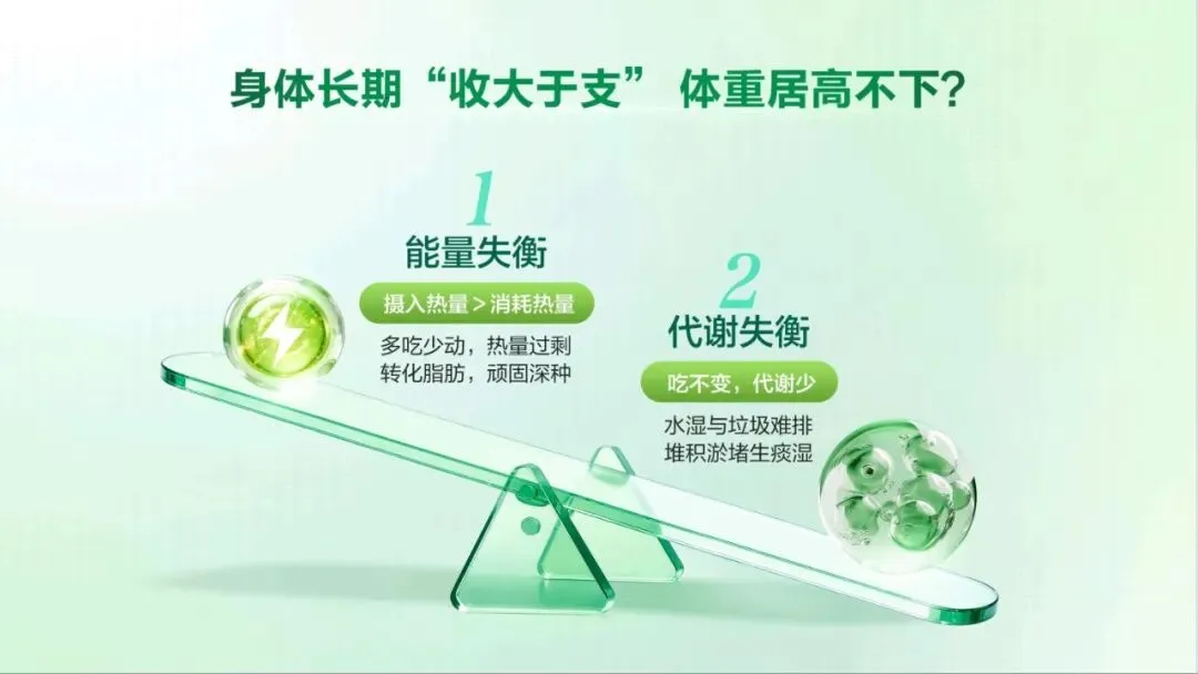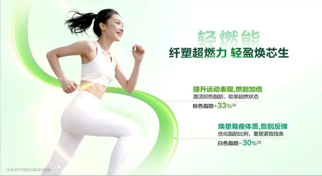 今天,非常荣幸能为大家介绍这款专为现代人代谢管理 打造的全新力作——代谢 CP。 代谢 CP 是由小茯星与躺赢菌组合而成,它们不仅承载 着完美在代谢领域多年深耕的科研结晶,更以“完美轻姿 520”为核心,帮助我们从容应对身体轻盈的挑战,开启健 康管理的新篇章。减脂困难,问题可能不止出在脂肪上。湿气重、代谢慢、 燃脂低、餐后体重增加等问题,都可能让减脂之路困难重重。 运动时汗流浃背但体重不变,这是燃脂低下的“无效 汗”;久坐不动,稍微吃点就容易囤脂肪,导致腰腹难减, 形成“游泳圈”;大餐一顿后,次日体重增加,让人后悔不 已;起床乏力、动则疲惫,是湿气淤堵导致的虚胖。这些问题都表明,减脂不能只关注脂肪,还要重视身体 的湿气和代谢状况体重居高不下,或许是身体长期“收大于支”。这包含 两个层面的失衡。其一为能量失衡,当摄入热量远超消耗热 量,多吃少动就会造成热量过剩,这些过剩的热量会逐渐转化为顽固的脂肪,在身体里扎根。 其二是代谢失衡,即便饮食量不变,但身体代谢能力降 低,水湿和垃圾难以排出体外,就会在体内堆积淤堵,进而 产生痰湿。所以,想要解决体重问题,需要从这两个失衡点 入手,调整能量摄入与消耗的平衡,提高身体代谢能力,减 少痰湿的产生常言道“十胖九湿”,湿气和肥胖往往如影随形。湿气 的程度不同,在身体上的表现也存在差异。湿气处于一级时, 主要表现在表面,会出现面部或头发油腻、口腔黏腻等症状。 到了二级,湿气深入肌肉,身体会有困重感,小腿像灌了铅 一样。发展到三级,湿气影响到骨骼,四肢会浮肿,关节也 会沉重酸痛。四级时,脏腑受到影响,会出现舌苔厚重黏腻、 口气重等情况。到了五级,湿气弥漫全身,人会变得肥胖, 还会感觉头重如裹。我们要多关注自身身体状态,判断自己 属于哪种湿气类型,才能更好地调理身体。身体感觉像被堵住,或许是“痰湿”体质在捣乱。“喝 水都胖”的根源在于痰湿困脾。当我们吃得多或压力大时, 肠胃就会“罢工”,导致代谢变慢,水湿排不出去,进而变 成“内湿”。随着湿气变黏,就会形成“痰”,这时人开始 发胖、脸油、痰多。“痰”还会堵住“气机”,让人身体“憋” 着火,出现虚胖、易上火的症状。最终,就形成了易胖体质, 减肥难且容易反弹。这就好比身体的“下水道”——脾胃功 能堵塞,喝的水、吃的食物排不出去,变成“垃圾”(痰湿) 堆积在体内。在人体每天总能量消耗中,基础代谢占据了 60%至 75%, 也就是说,我们静息状态下维持心跳、呼吸、体温等基本生 命活动所消耗的能量,才是真正的“大客户”。所以,掌控 好基础代谢,才能真正实现“轻盈自‘燃’而然”,让身体 成为一个高效的燃能系统。 那么,如何有效提升基础代谢? 关键看三个因素: 第二,脂肪比例。脂肪可分为白色脂肪与棕色脂肪,其中白 色脂肪是储存能量,棕色脂肪是产热耗能。也就意味着,白 色脂肪越少,棕色脂肪越多,基础代谢越高。 第三,肌肉含量。肌肉是身体的“燃能大户”,肌肉越多, 基础代谢越高芦荟茯苓组合物,能助力我们控脂赢、塑轻形。其燃脂 纤效果显著,能让脂肪占比降低 30%,相当于帮我们减少了 大量顽固脂肪,让身体更加轻盈。 湿气重会让身体像被湿布包裹,而该组合物能调节水液 分布,减轻身体的湿重感。实验数据显示,本组合物可以显 著改善水肿情况,帮助减少湿气困扰。 更令人惊喜的是,它在腰围改善效果表现非常出色,高 达 72%的体验官反馈腰围改善明显,让我们能明显看到身材 维度的变化,拥有更优美的身材曲线。芦荟茯苓组合物的作用机制是内源祛湿消脂两步走策 略,巧妙融合中医草本智慧与现代前沿科学。中医草本智慧 在调理“湿气”方面有着独特优势,能从根本上调节身体的 痰湿状况。现代前沿科学则在攻克“脂肪”问题上发挥关键 作用,助力身体更好地进行脂肪代谢。 该组合物包含多种有效成分,左旋肉碱和乌龙茶能加速 燃脂,减少脂肪吸收;芦荟、陈皮、茯苓、泽泻和荷叶则侧 重于健脾祛湿,调节痰湿体质,改善身体的代谢功能。这些 成分相互配合,共同为身体的健康和轻盈助力。“祛湿轻”这一核心卖点,关键在祛湿不滞留,实现消 肿更轻盈的效果,采用的是“一清、二调、三固”的祛湿黄 金组合策略。