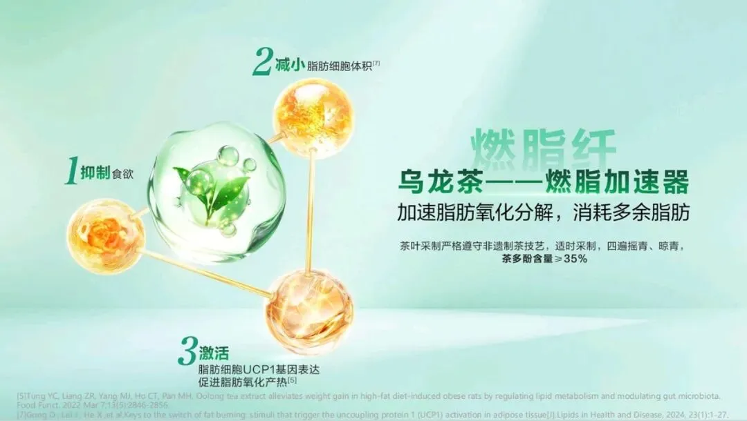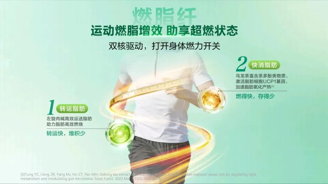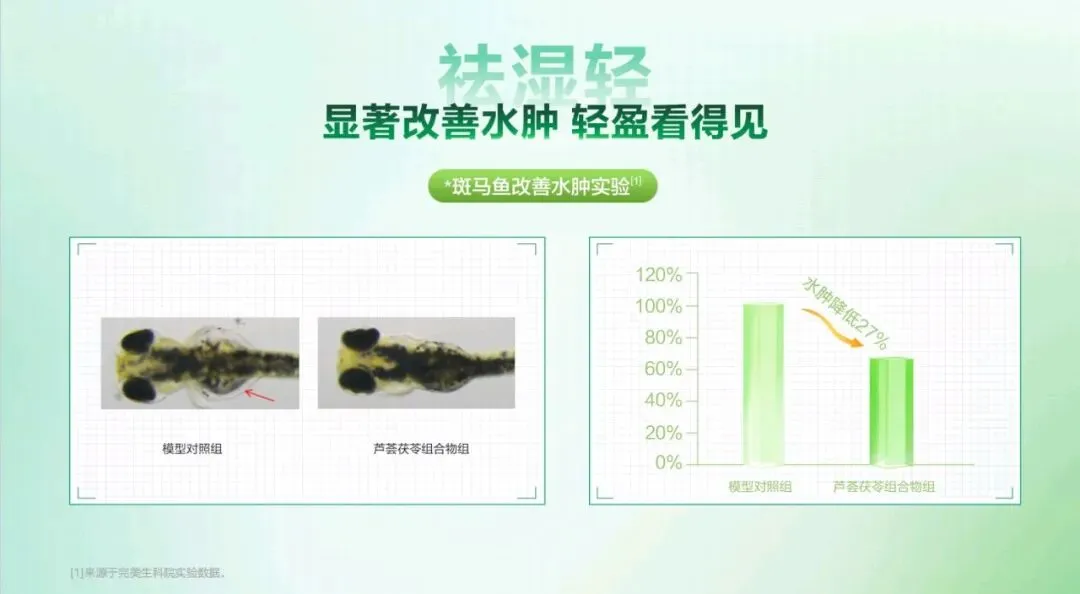 1 清内热,芦荟具有降火的功效,能扫除身体里郁结的 内热,让身体内部的火气得到释放。 2 调淤堵,茯苓和荷叶为主,辅以泽泻,能够调畅痰湿, 化解身体的淤堵状况,使身体的气血运行更加顺畅。 3 固本辅,陈皮可以理气,进而改善身体的运化功能, 达到健脾固本的作用,从根本上增强身体的祛湿能力,更好 地调理体质五重排水植萃采用 5 味草本君臣配伍,遵循自然法则, 如同给身体来一场“排湿 SPA”。芦荟作为君药,发挥润肠 通便、通腑泄热的作用,让体内的废物和热气得以排出。茯 苓、荷叶、泽泻作为臣药,茯苓健脾和中、利水渗湿,荷叶 升清降浊、醒脾化湿,泽泻化浊降脂、泄热化痰,三药协同, 调理痰湿、化解淤堵。陈皮作为佐使药,理气健脾、燥湿化 痰,改善运化、健脾固本。这种君臣配伍的方式,使各草药 相互配合,发挥最大功效,帮助我们有效祛湿。前面我们提到了芦荟茯苓组合物能内源祛湿消脂,接下 来看看它在改善水肿方面的显著效果。通过斑马鱼改善水肿 实验,我们得到了直观的数据。模型对照组与芦荟茯苓组合 物组对比,芦荟茯苓组合物组的水肿改善了 27%。这一数据 有力地证明了该组合物在祛湿轻方面的有效性,能让我们实 实在在地感受到身体的轻盈。一方面,线粒体是细胞燃烧燃料(包括脂肪)产生能量 的地方。长链脂肪酸作为身体重要的供能成分,无法进入线 粒体这个“能量工厂”,它需要一个“搬运工”带它进入工 厂。左旋肉碱就是这个“搬运工”,将长链脂肪酸运至线粒 体中燃烧供能。左旋肉碱通过提高运动效率,确保足够多的 脂肪酸能被及时送进线粒体这个“锅炉”里充分燃烧,这样 一来,脂肪转运快,堆积自然就少了。 另一方面,乌龙茶富含茶多酚类物质,可以激活脂肪细 胞 UCP1 基因,加速脂肪氧化产热。如此,脂肪燃烧得快, 储存得更少。 双核燃脂引擎成分,左旋肉碱与乌龙茶能让运动燃脂效 果倍增,助享超燃状态。通过双核驱动,打开身体的燃力开 关,帮助快消脂肪左旋肉碱堪称脂肪专属快递员,搭配运动使用,能加速 脂肪酸转运,为身体燃烧脂肪助力,提高运动效率。依据《GB 24154 - 2015 食品安全国家标准 运动营养食品通则》,运 动营养食品中左旋肉碱每日推荐量为 1 - 2g,然而人体自身每日合成量仅约 0.02g,所以额外的膳食补充十分必要。 这款组合物拥有双专利加持,这让我们在追求轻盈体态 时更有底气。它不仅能促进脂肪转运至线粒体氧化分解,减 少脂肪堆积,还能提高肌肉力量,防止乳酸积累,减缓运动 疲劳感。每 100g 组合物中含左旋肉碱 20.0g,为高效燃脂 提供有力保障。乌龙茶是当之无愧的“燃脂加速器”,能加速脂肪氧化 分解,消耗多余脂肪。其茶叶采制严格遵守非遗制茶技艺, 适时采制,经过四遍摇青、晾青,使得茶多酚含量≥35%,为高效燃脂奠定了基础。从作用机制来看,乌龙茶能抑制食欲,从源头上减少热 量摄入;可以减少脂肪细胞体积,让脂肪无处堆积;还能激 活脂肪细胞 UCP1 基因表达,促进脂肪氧化产热,真正实现 科学燃脂。科学有力的数据支撑减重塑形效果,真正做到了科学燃 脂。棕色脂肪作为产热型脂肪,能消耗能量为人体供能,对 燃脂塑形有重要作用。 对比模型对照组和芦荟茯苓组合物组可以看到,使用芦 荟茯苓组合物后,脂肪细胞堆积显著减少,可有效避免脂肪 堆积。并且,棕色脂肪增加了 68%。这意味着芦荟茯苓组合物能明显增强身体产热能力,加速脂肪燃烧,实现科学高效燃脂。不同的肥胖类型有着各自的困扰,而我们的组合物能为 不同类型的人群带来解决方案。