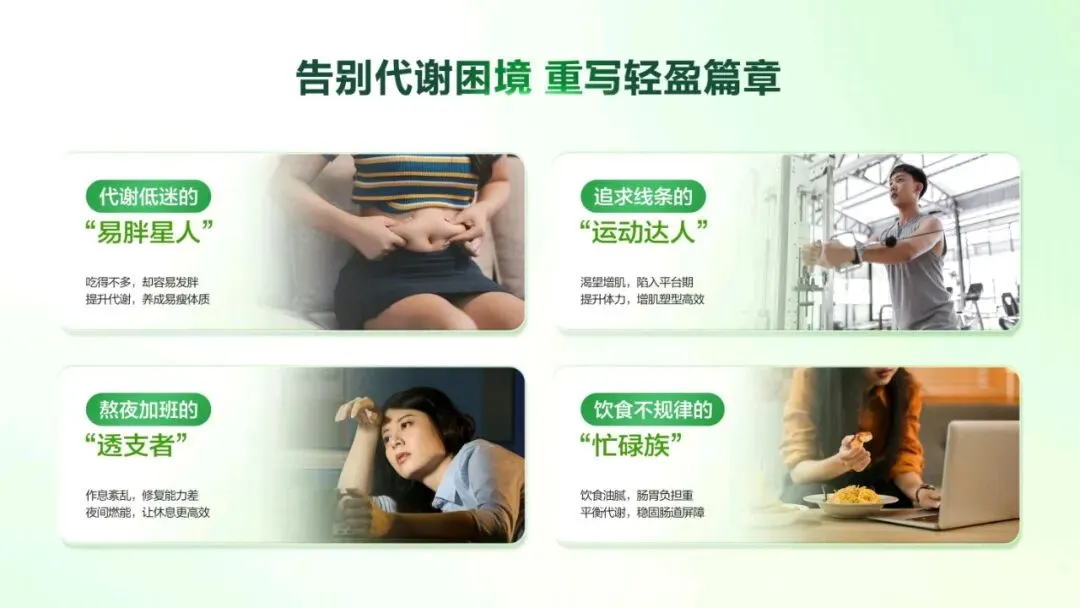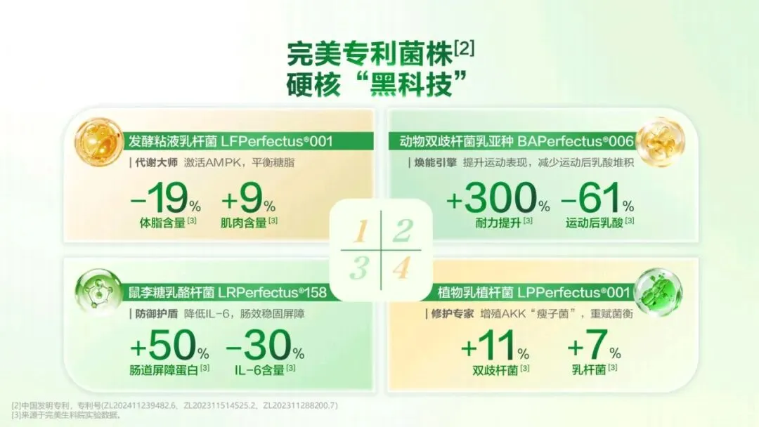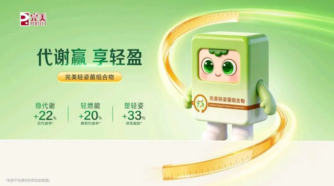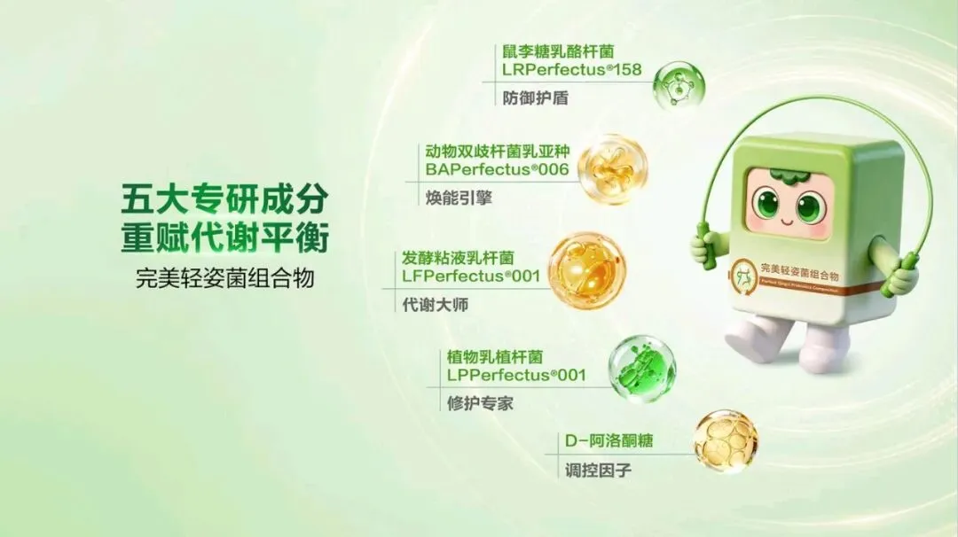 对于长期节食却易反弹的“易胖型”人群,组合物能打破易胖魔咒,让他们轻松享瘦。优质代谢是关键,好的代谢能带来好身材、好精神和好状态。注重养生却见效慢的“湿胖型”人群,使用组合物可告别身体的沉重感,变得身轻如燕。坚持运动但遇瓶颈的“效能型”人群,组合物能提升燃脂效果,让运动达到事半功倍的效果。代谢失衡却难回稳的“恢复型”人群,组合物可以焕活代谢,使他们重新回归轻盈状态。组合物在不同时段能发挥独特功效,开启全天轻循环。 早晨醒来,身体或许存在隔夜淤堵,这时使用组合物可消褪淤堵,让身体恢复清晰轮廓,带来轻盈体感,为新的一天注入活力。到了上午工作时段,久坐易导致身体肿胀,组合物能帮助缓解这种肿胀,在你专注攻克工作时,它默默攻克脂肪和湿气,助你保持良好状态。运动前服用本组合物,能有效提升运动燃脂效率。处于黄金燃脂期,使用组合物能让同样的 30 分钟运动更有价值,汗水流得更值得,使运动效果显著提升。组合物采用纯净植萃配方,搭配明星燃脂搭档,实现 520安心瘦,双效自御加乘。植萃成分天然纯净,为身体带来温和且高效的调理。明星燃脂搭档则如同助力的引擎,加速脂肪燃烧,让瘦身效果更加显著。更值得一提的是,组合物做到了 0 防腐剂添加。这意味着我们可以安心使用,不用担心防腐剂带来的潜在危害,真正实现安心塑轻形。现在继续给大家带来一场关于“代谢赢享轻盈——完美 轻姿菌”的讲解它不仅承载着完美在益生菌领域多年深耕的科研结晶,更以“菌衡代谢”为核心,帮助我们从容应对身体轻盈的挑战,开启健康管理的新篇章。在我们的日常生活中,相信很多人都深有体会:吃得不多,肉却不少;体重反反复复,怎么减都减不下来;明明已经很努力控制饮食,却依然收效甚微。这些问题的背后,其 实隐藏着一个关键的原因——代谢失衡。我们可以把身体想象成一台精密的机器,当基础代谢变弱,脂肪比例失衡,身体就会慢慢陷入“易胖难瘦”的困局。吃得少不一定瘦,动得多不一定有效,这就是代谢失衡带来的“隐形枷锁”。为此,我们打造了完美轻姿菌组合物,以五大专研成分为核心,重赋代谢平衡。它们分别是: 发酵粘液乳杆菌 LFPerfectus001——可称为“代谢大师”;