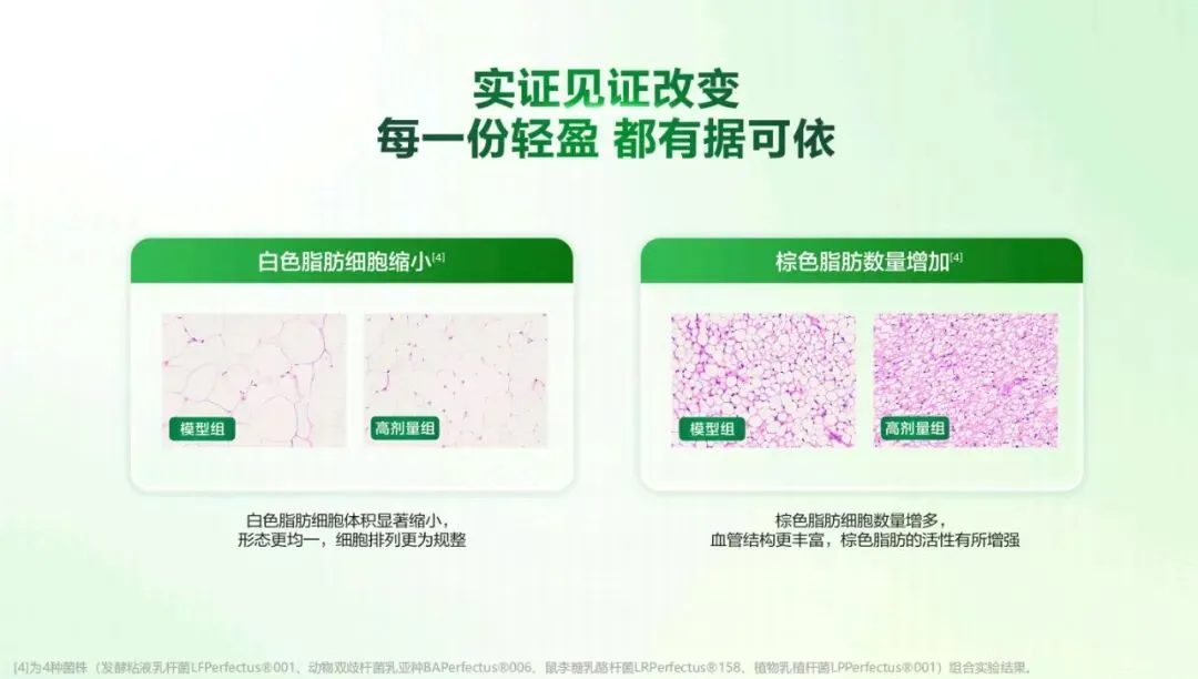 这五大成分,各自承担不同的代谢调节功能,协同作用,直击代谢核心。更值得一提的是,我们的菌株拥有完美自有专利技术, 每一项都有扎实的科研数据支撑。发酵粘液乳杆菌 LFPerfectus001,可以激活 AMPK 代谢通路,帮助平衡糖脂代谢。实验数据显示,使用后体脂含量下降 19%,而肌肉含量提升 9%。动物双歧杆菌乳亚种 BAPerfectus006,能显著提升运动表现,耐力提升 300%,运动后乳酸减少 61%,让我们运动更持久、恢复更迅速。鼠李糖乳酪杆菌 LRPerfectus158,帮助稳固肠道屏障,IL-6含量下降 30%,肠道屏障蛋白提升 50%,为身体筑牢第一道防线。植物乳植杆菌 LPPerfectus001,则能促进“瘦子菌”AKK 的增殖,双歧杆菌和乳杆菌分别提升 11%和 7%。这些数据,充分体现了我们从菌株源头打造的硬核科技力。基于这些核心成分,我们构建了菌衡代谢“双通路”,从两个维度协同作用。一是稳代谢,维稳代谢力,激活代谢通路,促进糖脂转化,提升静息代谢,让身体在安静状态下也能高效耗能;二是轻燃能,纤塑超燃力,优化脂肪产热通路,唤醒身体“燃能自动模式”,让燃脂变得更智能、更高效。基于这些核心成分,我们构建了菌衡代谢“双通路”, 从两个维度协同作用:一是稳代谢,维稳代谢力,激活代谢通路,促进糖脂转化,提升静息代谢,让身体在安静状态下也能高效耗能;二是轻燃能,纤塑超燃力,优化脂肪产热通路,唤醒身体“燃 能自动模式”,让燃脂变得更智能、更高效。在“稳代谢”方面,我们可以提升代谢,提高静息耗能。 那么,什么是静息代谢、静息耗能?简单来说,就是身体在安静状态下,比如坐着、躺着、甚至睡觉时,维持心跳、呼吸、体温等基本生命活动所消耗的能量。这部分的基础代谢耗能占每日能量消耗的 60%-75%,是我们每天能量消耗的“大头”。通过激活代谢通路,我们实现了静态高耗能。实验数据显示,总代谢率提升 22%,静息代谢率提升 20%。同时,促进糖脂转化,餐后血糖降低 55%,低密度脂蛋白降低 64%,减少肉肉堆积。这意味着什么? 意味着即使我们坐在办公室、躺在床上休息,身体也在悄悄地进行着高效的能量消耗——真正实现“躺盈、躺瘦”。这对于我们这些工作忙碌、没时间运动的人来说,无疑 是一种极大的福音。无需剧烈运动,也能让身体处于高效燃能状态,轻松享瘦。在“轻燃能”方面,我们可以提升运动燃力,焕塑易瘦体质。通过激活棕色脂肪、增强运动表现,帮助身体进入“超燃状态”。大家可能不太了解,棕色脂肪是我们身体的“燃能工厂”。大家有没有观察过小婴儿?他们体温偏热,走几步路就容易出汗,就是因为婴幼儿时期棕色脂肪非常丰富,身体天然处于高效燃能状态。但随着年龄增长,棕色脂肪会逐渐减少,白色脂肪不断堆积,这也是为什么我们成年后更容易感到“怕冷”、代谢、变慢、更容易囤积脂肪的原因之一。而我们的组合物,正是帮助唤醒和增加“好脂肪”即棕色脂肪,减少“坏脂肪”即白色脂肪,从整体上优化脂肪比例。实验数据显示,使用完美轻姿菌组合物后棕色脂肪增加33%,白色脂肪减少 30%。这意味着,不仅燃脂更高效,还能帮助重塑身体线条,告别反复反弹的困扰,真正打造“易瘦体质”。效果不仅停留在数据上,我们在实证研究中也看到了真 实的变化。在高剂量组中,白色脂肪细胞体积显著缩小,形态更均一,排列更规整;而棕色脂肪细胞数量明显增加,血管结构更丰富,活性增强。这些变化,是组合物科学配方的真实见证,也是我们能够自信地向大家推荐这个组合物的原因。在配方上,我们始终坚持低糖纯净的理念。采用“益生菌+益生元”双益组合,每袋添加不少于 500亿活菌,并且这些菌株耐胃酸、耐胆盐、耐肠液,确保能够活着到达肠道,发挥真正的作用。同时添加 D-阿洛酮糖,作为一种代谢调控因子,它能促进 GLP-1 的生成,帮助持续多维管理体态。更重要的是,这款组合物做到了低糖、0 反式脂肪、0 兴奋剂,真正做到安心享轻盈,让消费者用得放心总的来说,我们可以用“520”来表达完美轻姿代谢密 钥。首先,“5 大专研成分” ,即 4 个完美专研创新菌株加 D-阿洛酮糖,其次,“2 菌衡代谢双通路”,即通过构建“激活代谢通路”与“优化脂肪比例”双通路,实现“稳代谢”与“轻 燃能”的双重目标。最后,0 指是 0 反式脂肪、0 兴奋剂,实现安心享轻盈。它不仅是一个益生菌组合物,更是一款真正意义上的代谢管理新组方。在口感上,我们也没有妥协。组合物采用清新玫瑰茄口味,入口酸甜,清爽怡人,带来味蕾的奇妙新体验,让每一次饮用都成为一种享受,而不是负担。此外,玫瑰茄蕴含多重活性物质,例如酚酸、黄酮、有机酸、花色苷等,在带来美妙口感的同时,也为轻盈助力加分我们希望,通过这个组合物,帮助更多人告别代谢困境, 重写轻盈篇章。无论是代谢低迷的“易胖星人”、追求线条的“运动达人”,还是熬夜加班的“透支者”、饮食不规律的“忙碌族”,都能在它的助力下,找到属于自己的轻盈之道。