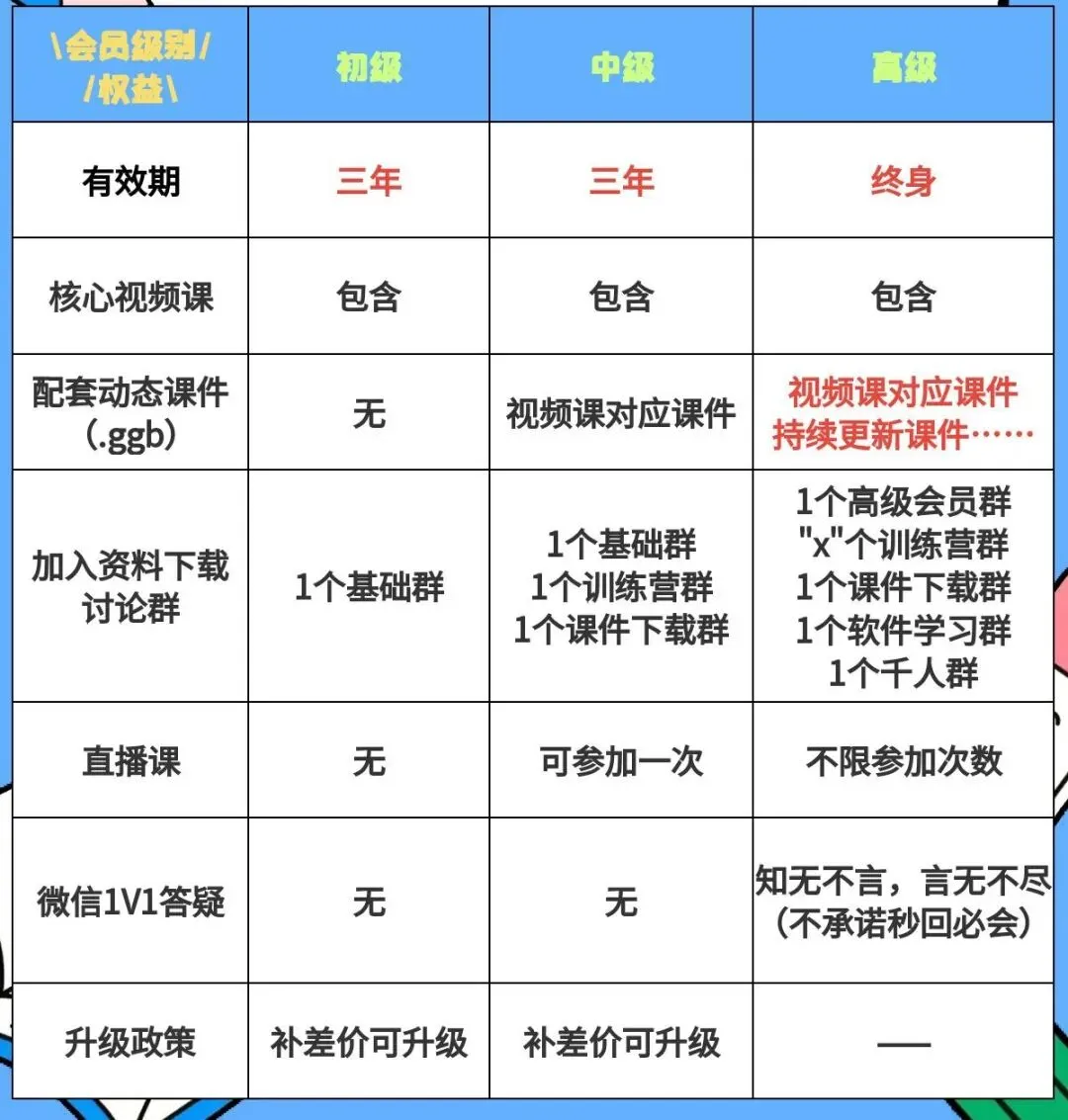 核心视频课(无限次回放)+直播导学分享答疑(直播可回放)+群内讨论+答疑解惑,辅助以ggb动态课件(初级课程不含直播课和课件)等资料,