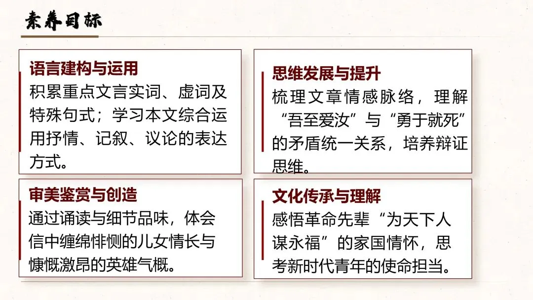 2.思维发展与提升:梳理文章情感脉络,理解“吾至爱汝”与“勇于就死”的矛盾统一关系,培养辩证思维。