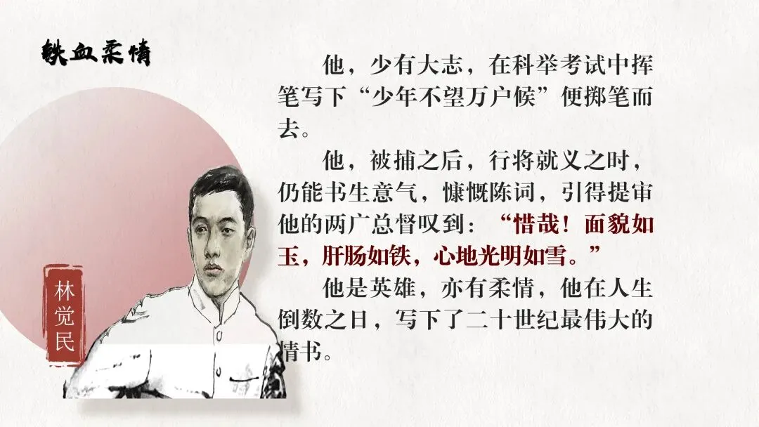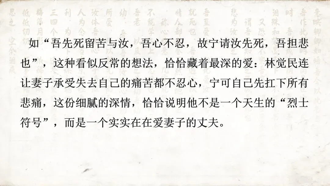 再比如“吾先死留苦与汝,吾心不忍,故宁请汝先死,吾担悲也”,这种看似反常的想法,恰恰藏着最深的爱:林觉民连让妻子承受失去自己的痛苦都不忍心,宁可自己先扛下所有悲痛,这份细腻的深情,恰恰说明他不是一个天生的“烈士符号”,而是一个实实在在爱妻子的丈夫;