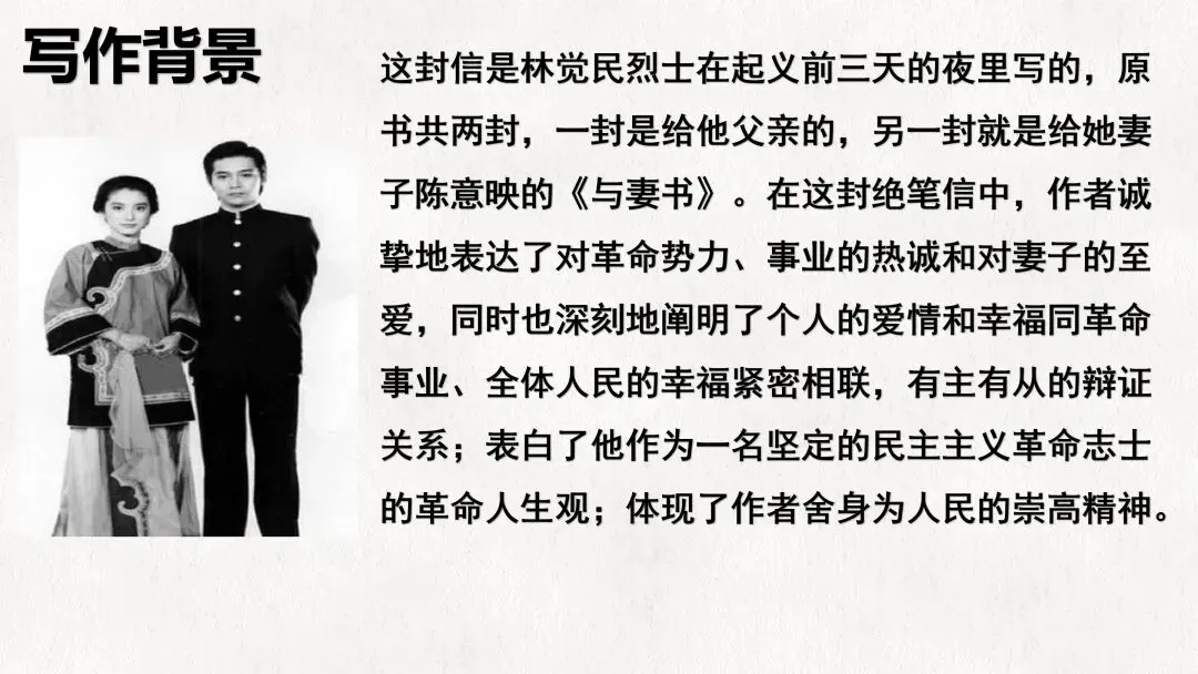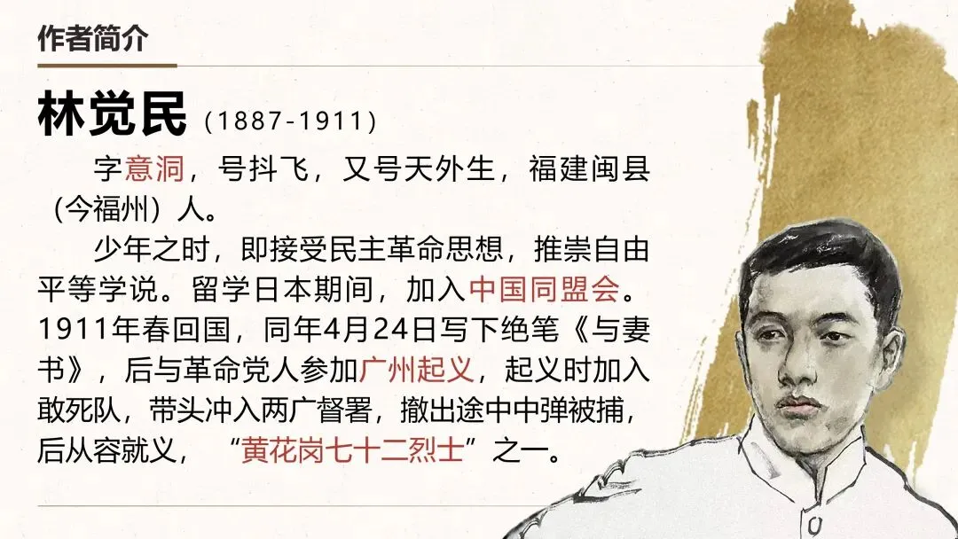 【教材分析】《与妻书》是辛亥革命先驱林觉民在广州起义前写给妻子的绝笔家书。本文情理交融,既有“吾至爱汝”的缱绻深情,又有“勇于就死”的浩然正气,是引导学生体会革命先烈的“抱负与使命”,理解“小爱”与“大义”关系的经典文本。【素养目标】