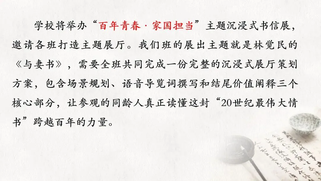 学校将举办“百年青春·家国担当”主题沉浸式书信展,邀请各班打造主题展厅。我们班的展出主题就是林觉民的《与妻书》,需要全班共同完成一份完整的沉浸式展厅策划方案,包含场景规划、语音导览词撰写和结尾价值阐释三个核心部分,让参观的同龄人真正读懂这封“20世纪最伟大情书”跨越百年的力量。