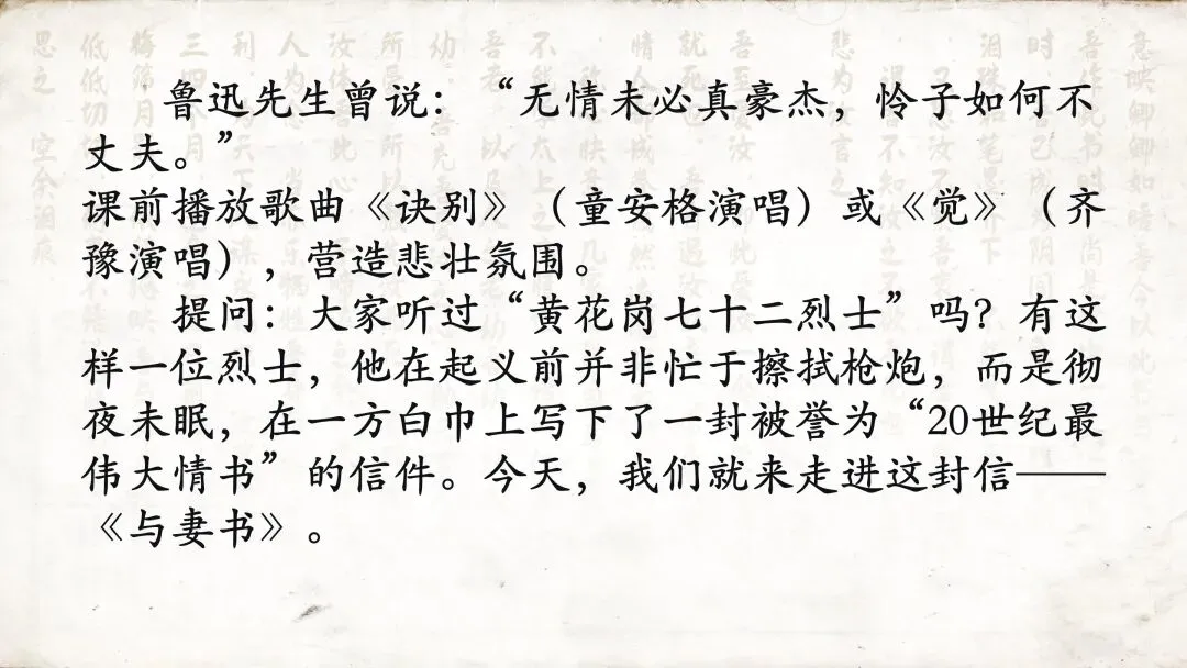 以鲁迅的名句“无情未必真豪杰,怜子如何不丈夫”切入,课前播放齐豫的《觉》(改编自《与妻书》),在音乐中引出问题:1911年广州起义前,24岁的林觉民在一块白巾上写下这封给妻子的绝笔,为什么一百年后它还能被称为“最伟大的情书”?今天我们就通过策划展厅,一起走入林觉民的内心世界。