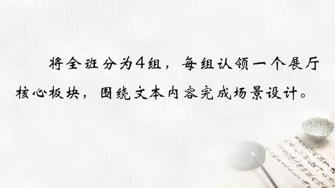 分组梳理场景:将全班分为4组,每组认领一个展厅核心板块,围绕文本内容完成场景设计:
