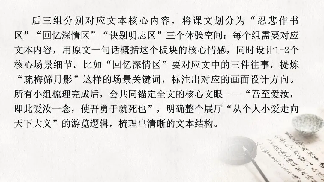后三组分别对应文本核心内容,将课文划分为“忍悲作书区”“回忆深情区”“诀别明志区”三个体验空间:每个组需要对应文本内容,用原文一句话概括这个板块的核心情感,同时设计1-2个核心场景细节。比如“回忆深情区”要对应文中的三件往事,提炼“疏梅筛月影”这样的场景关键词,标注出对应的画面设计方向。 所有小组梳理完成后,会共同锚定全文的核心文眼——“吾至爱汝,即此爱汝一念,使吾勇于就死也”,明确整个展厅“从个人小爱走向天下大义”的游览逻辑,梳理出清晰的文本结构。