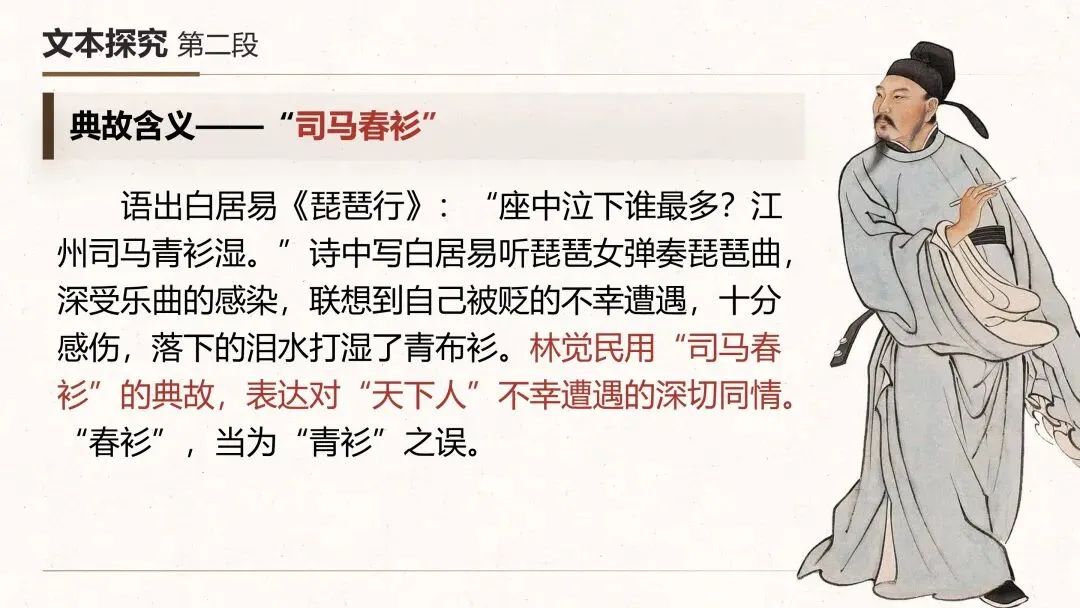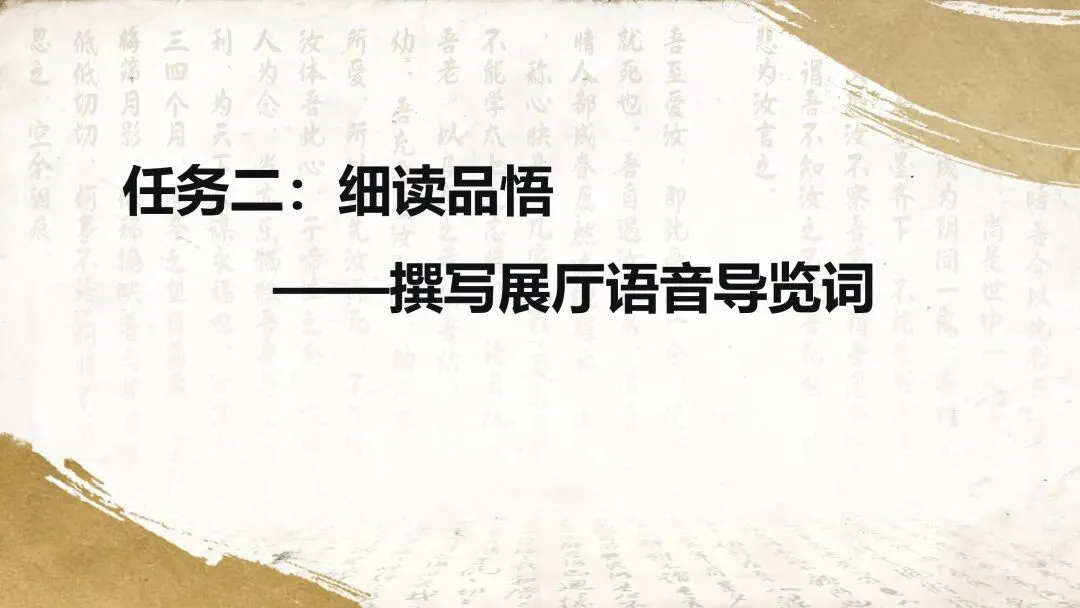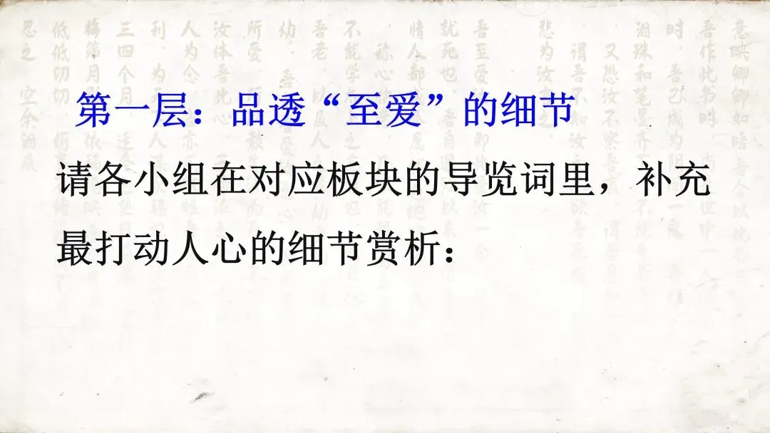 还有“则教其以父志为志”,写出了他最矛盾的心情:既希望孩子能继承自己的志向,又清清楚楚知道,妻子一个人养大孩子有多难,这份体谅,把一个即将赴死的丈夫的不舍,写得入木三分。 所有小组把细节赏析写入导览词后,请2-3组朗读展示,引导学生体会:正是因为林觉民把对妻子的爱写得这么痛、这么深,他最后的选择才更有力量。