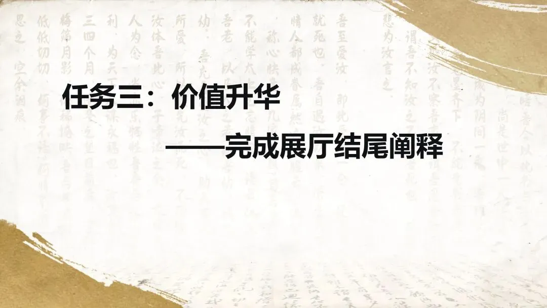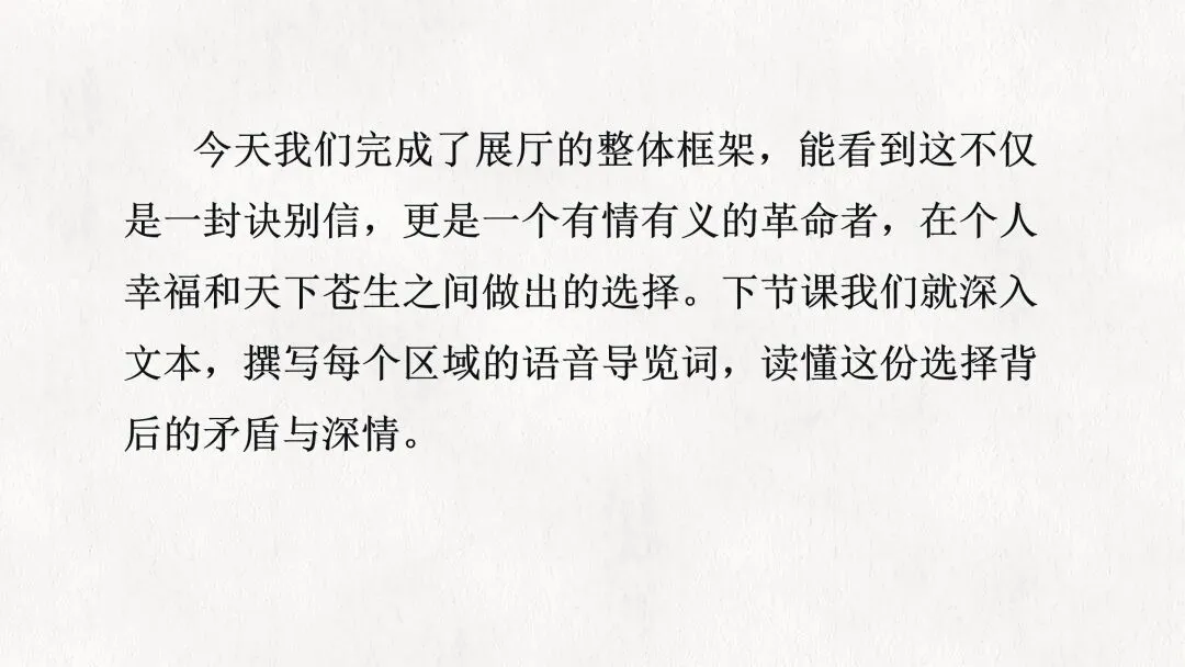 小结:今天我们完成了展厅的整体框架,能看到这不仅是一封诀别信,更是一个有情有义的革命者,在个人幸福和天下苍生之间做出的选择。下节课我们就深入文本,撰写每个区域的语音导览词,读懂这份选择背后的矛盾与深情。