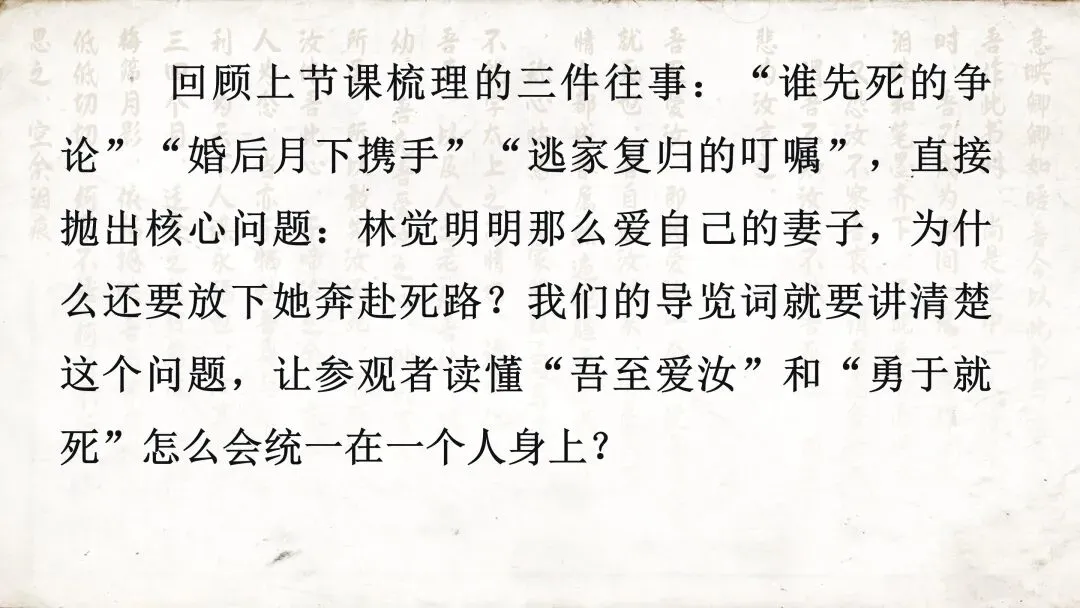 回顾上节课梳理的三件往事:“谁先死的争论”“婚后月下携手”“逃家复归的叮嘱”,直接抛出核心问题:林觉明明那么爱自己的妻子,为什么还要放下她奔赴死路?我们的导览词就要讲清楚这个问题,让参观者读懂“吾至爱汝”和“勇于就死”怎么会统一在一个人身上?