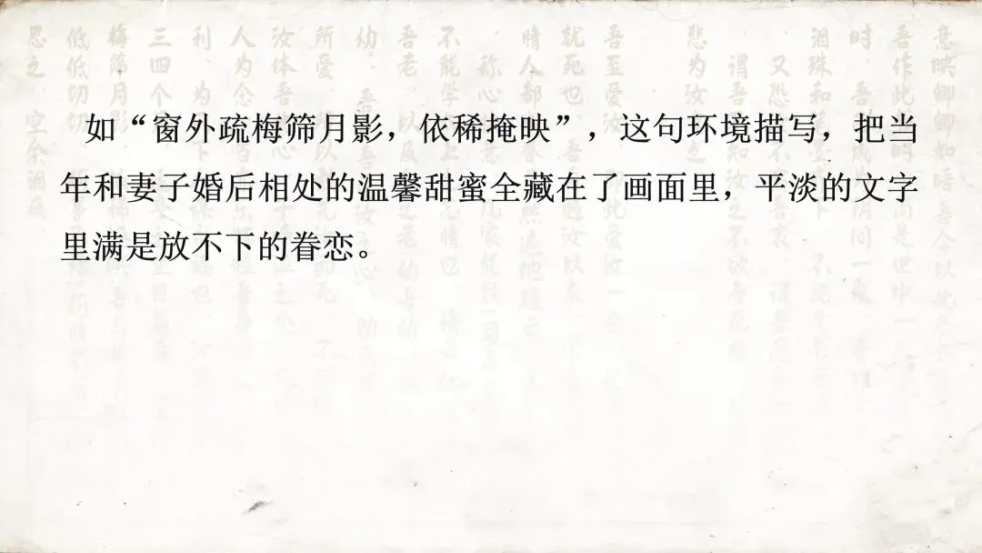 比如“窗外疏梅筛月影,依稀掩映”,这句环境描写,把当年和妻子婚后相处的温馨甜蜜全藏在了画面里,平淡的文字里满是放不下的眷恋;