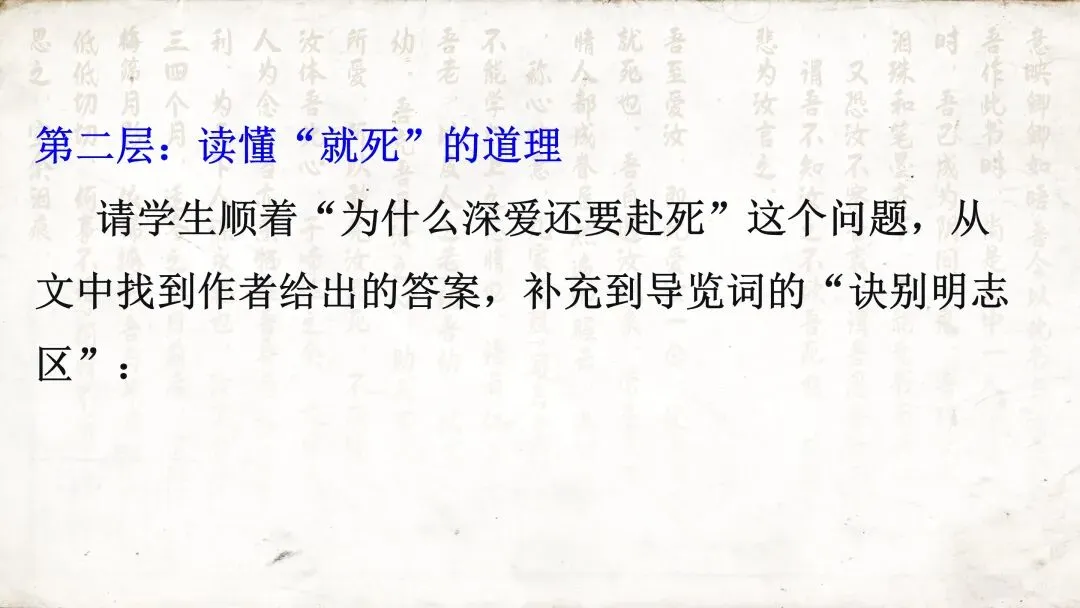 请学生顺着“为什么深爱还要赴死”这个问题,从文中找到作者给出的答案,补充到导览词的“诀别明志区”: