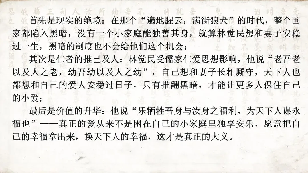 其次是仁者的推己及人:林觉民受儒家仁爱思想影响,他说“老吾老以及人之老,幼吾幼以及人之幼”,自己想和妻子长相厮守,天下人也都想和自己的爱人安稳过日子,只有推翻黑暗,才能让更多人保住自己的小爱;